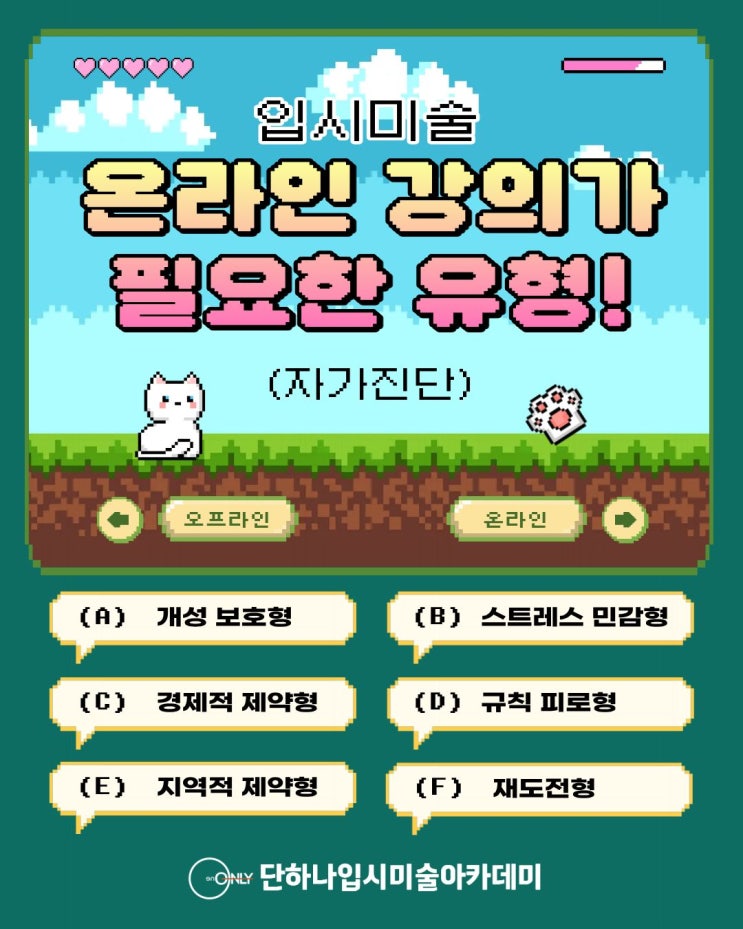 ✔️ 온라인강의 만으로도 미대진학을 할 수 있는 커리큘럼을 갖고 있는데, 오프라인 수업은 두 말할 필요가 있을까요? 안녕하세요. 단하나미술학원 입니다. 오늘은 출석하여 다니는 오프라인 미술학원과 미대입시 온라인 강의에 관한 얘기를 하고 싶습니다. 오프라인 미술학원, 참 좋습니다. 그러나. 모든 학생의 성향과 성격이 다 다르듯이 출석하는 미술학원보다 입시미술 온라인 강의가 더 잘 맞고, 꼭 필요한 학생도 있습니다. 오랫동안 학생을 지도하다 보면, 실력과 의지가 부족해서가 아니라 '환경' 때문에 무너지는 학생들이 있었습니다. 특히 오프라인 미술학원은 "모두에게 좋은 방식"처럼 보이지만, 어떤 학생에....... <img src="https://blogthumb.pstatic.net/MjAyNjAxMjhfMTY1/MDAxNzY5NTkwMDQyNzM5.nBRi_S-jv_AgPPh1GAcyg3Ai9O484ZIqJhZFXYKrpqkg.NNxcbjDYyTs_MCuZ5Li3VM53w2i8xceoURXuAMyAZsog.JPEG/1.jpg?type=s3" />