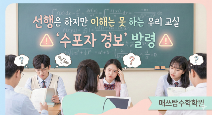 안녕하세요. 매쓰탑수학학원입니다. 새 학년을 준비하며 아이들의 수학 진도 문제로 고민 많으시죠? 최근 KBS 뉴스에서 보도된 '수포자(수학 포기자) 실태' 영상 보셨나요? 현장의 목소리와 통계가 너무나 충격적이면서도, 한편으로는 우리가 왜 '제대로 된 관리'에 집중해야 하는지 명확히 보여주는 내용이라 함께 나누고자 합니다. 교실에 울리는 '수포자 경보', 남의 일이 아닙니다. 10명 중 3명은 수학을 포기하고 싶어 합니다. 전국 초·중·고 학생 10명 중 3명(30.8%)이 수학을 포기하고 싶다고 답했습니다. 더 심각한 것은 학년이 올라갈수록 이 비율이 가파르게 상승한다는 점입니다. * 초6: 18% * 중....... <img src="https://blogthumb.pstatic.net/MjAyNjAxMzBfMTc4/MDAxNzY5NzAxMDA2NzM2.QQ0AFbofxlHGWaT3dFy8FsApd2Hfvz40eTjkrNg-PMEg.ly1xxKc9jM3F071AL9g2rPa7aWDXYIN3MyDq8-5sF5Ug.PNG/900%A3%DF1769699956534.png?type=s3" />