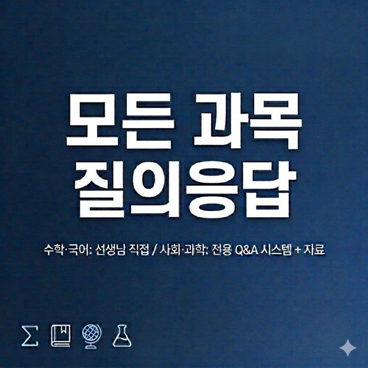 과학이나 사회 학교 족보도 필요하고 질문도 하고 싶은가요? 과학은 그래도 학원을 다니지만 사회는 잘 안다니게 되죠? 그래서 그냥 무조건 외우기만 해서 시험 대비를 했을 건데요. 과학과 사회도 엄연히 중요한 내신 과목 이라 잘해야 할 텐데요. 학원을 다니자니 비용도 좀 그렇고 또 왠지 혼자 가능할 것 같습니다. 저도 이 부분이 늘 아쉬웠습니다. 수학이야 제가 직접 봐주고, 국어도 전문 선생님이 계시니까 괜찮은데, 사회랑 과학은 막히면 그냥 혼자 끙끙대야 하는 상황이었거든요. 그래서 바꿨습니다. 3월 부터 저희 관리형 독서실에 사회 과목과 과학 과목의 내신·수능 질의응답 시스템을 도입했습니다. 이제 독서실에서 공부하다가 사....... <img src="https://blogthumb.pstatic.net/MjAyNjAzMjdfMTgg/MDAxNzc0NjEzNTk1NDE3.ynsTI44koS9w-JI5wPsoCaogwKxSOtOvrMhBNI41FG4g.JcRY1DKIRECb1jn7UgwlUy9i5MV-VH1PAuRJsCIceBkg.JPEG/89d50add-86a8-40f8-b641-a68c692b72a4.jpeg?type=s3" />