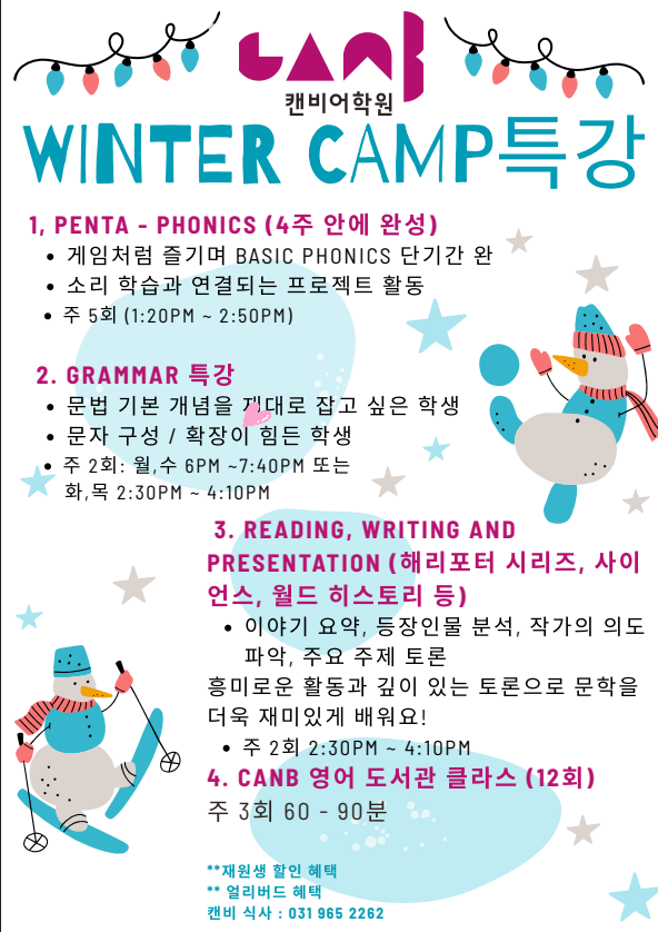 ❄️ 캔비어학원 겨울방학 WINTER CAMP 특강 안내 겨울방학을 알차게 보내고 싶은 학생들을 위한 캔비어학원 WINTER CAMP 겨울방학 특강이 개설되었습니다! 이번 특강은 파닉스부터 문법, 독서·라이팅·발표까지 영어의 기본기와 사고력을 동시에 키울 수 있도록 구성되었습니다. 프로그램 안내 1️⃣ PENTA1 PHONICS (4주 완성) 게임처럼 즐기며 배우는 베이직 파닉스 소리 학습과 연계된 프로젝트 활동 주 5회 (1:30PM ~ 3:00PM) 2️⃣ GRAMMAR 특강 예비중 대비 문법 기본 개념을 확실히 정리 문장 구성과 확장이 어려운 학생 추천 주 2회 월·수 6:00PM ~ 7:40PM 또는 화·목 2:30PM ~ 4:10PM 3️⃣ READING · WRITING · PRESENTATION (해....... <img src="https://blogthumb.pstatic.net/MjAyNTEyMTdfMTE4/MDAxNzY1OTM2MTMyNTgw.0bx_V0Zn2-oJnK1xMQQEb4mjXqxYol4_Jp3iD6iWVT0g.IdSB2YEj7xAVNZ5RNZS9I69D_VlyOm_y9DkL4w0gCL0g.PNG/54204.png?type=s3" />