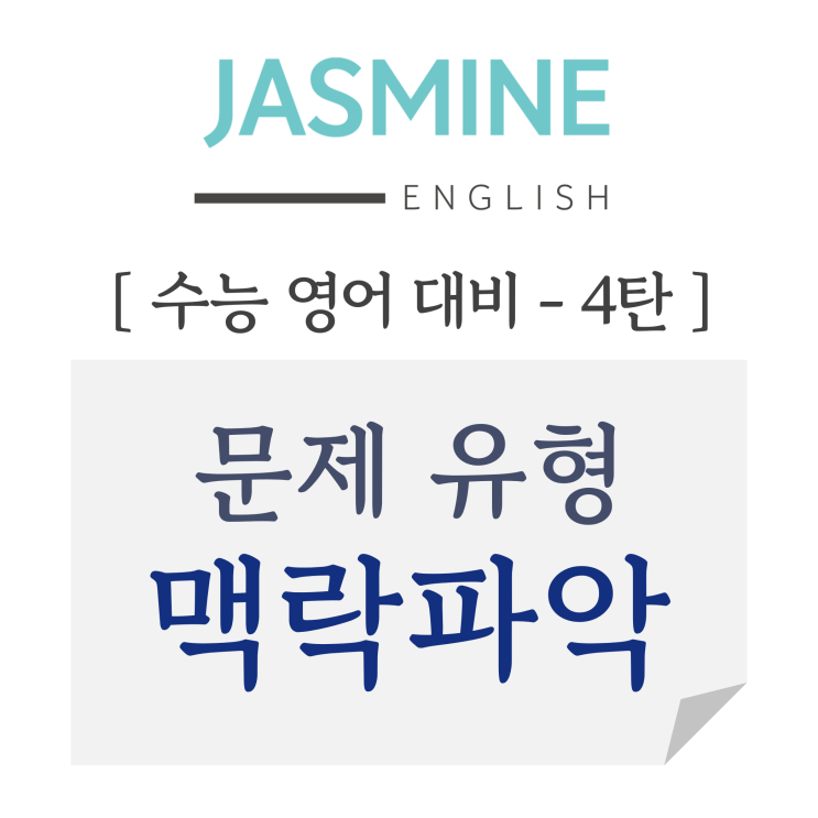 안녕하세요. 재스민영어 입니다. :) 지난 수능 영어 시리즈에서는 1탄 문제 유형 개요, 2탄 대의파악, 3탄 빈칸추론 유형을 차례로 살펴봤습니다. 이번 포스팅에서는 수능 영어 시리즈 4탄, 문제 유형 ‘맥락파악’에 대해 유형별 특징과 풀이 전략을 정리했습니다. 평소 이 유형에 대해 어려움을 느낀 학생들은 꼭 참고해주세요! '맥락파악'이란? '맥락파악' 유형은 수능 영어 독해 유형 중에서도 오답률 상위에 해당하는 고난도 유형입니다. 빈칸추론과 마찬가지로, 이 유형도 1등급을 가르는 결정적인 역할을 하는 문제에요. 원리를 알고 접근하면 가장 안정적으로 점수를 올릴 수 있는 유형이기도 합니다. 이 유형의 핵....... <img src="https://blogthumb.pstatic.net/MjAyNTEyMThfMjM1/MDAxNzY2MDQ0OTU5ODg1.c0cU1r7fceY9JBGmhKRJWHtf1tDpA4XPb-q-Yx8tI7gg.4eGdDG-wPPkEF2lf43UVKBrd0AeGXTAOs1RGkYiIAOkg.PNG/%BA%ED%B7%CE%B1%D7%BD%E6%B3%D7%C0%CF.png?type=s3" />