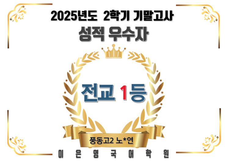 2025년도 2학기 기말고사 성적우수자 전교 1등 풍동고2 노*연 정발고2 김*연 . . . 전교 1등은 언제나 눈길을 끕니다. 하지만 한 번의 성과만으로 학원을 판단하기는 어렵습니다. 저희 학원에서는 이번 2학기 기말고사를 포함해 정발고 2학년과 풍동고 2학년 두 학교에서 전교 1등이 반복적으로 이어졌습니다. 누적되는 결과로 증명합니다. ㅡ이은영국어학원ㅡ . . . https://m.blog.naver.com/peppermint0123/224102967704 결과로 증명합니다 이은영 국어학원 <img src="https://blogthumb.pstatic.net/MjAyNTEyMTlfMTA5/MDAxNzY2MTQyNzAzMTI1.r-gzQMjK6lfBKr5Dv4dO_tV8VUntybozbKI51a6QukEg.tI2NrThjEl6qFsSh7gPsawUTQGbgaMyUfBX4LeRgKnMg.PNG/900%A3%DF%C1%A6%B8%F1%C0%BB%A3%AD%C0%D4%B7%C2%C7%D8%C1%D6%BC%BC%BF%E4%A3%DF%A3%AD010_%A3%AD_2%A3%A81%A3%A9.png?type=s3" />