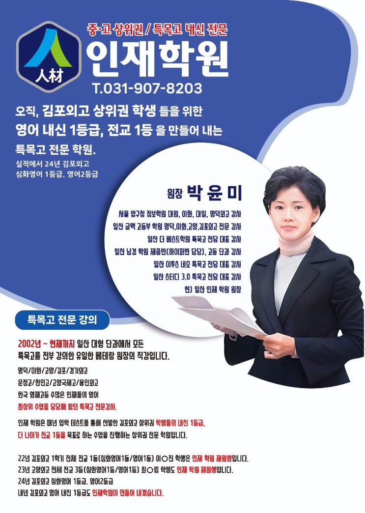 1.대상: 김포외고 상위권 내신 목표학생 2. 수업시간: 3. 김포외고 심화영어.공통영어 영어 내신 1등급을 목표로 하는 수업 입니다. 검증되지 않은 과대 광고보다는 김포외고 상위권 재학생 선배들이 가장 많이 추천하는 10명 정원팀 수업으로 개인마다 맞춤 관리를 받는 학원입니다. 4. 방학 중 과제와 독후감 목록 도서 등 김포외고 선배들이 기증한 도서를 학원에서 대여하여 방학과제 완성 및 장학고사 대비. 입학 후 우수한 세특을 위한 수행, 활동등을 집중 관리 하는 상위권대학 진학 목표 팀 수업입니다. 5. 김포외고 내신 등급을 결정하는 학교 어휘교재를 학교시험과 동일 유형으로 매일 학생들이 자가 시험을 본 후 제출하는 철저한 관....... <img src="https://blogthumb.pstatic.net/MjAyNTEyMjNfMjI0/MDAxNzY2NDkxODA0MDk4.s0sUwcF9QsjkTB8YEAGGb09iVEOxlQRwObEFmGPr2Vwg.s1mzYdLm-LW2smcqCeFuucYXUXsdbaoLf5zmmMkMjgsg.JPEG/%C0%CE%C0%E7%C7%D0%BF%F8_%BF%F8%C0%E5%B4%D4_%C7%C1%B7%CE%C7%CA.jpg?type=s3" />