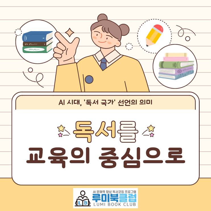 안녕하세요 아이들의 생각을 키워주는 생각코치 루미쌤입니다 2026년 1월 23일, 국회의사당에서 교육 문화계 주요 인사들이 모여 '독서 국가' 선포식을 열었다는 사실, 알고 계셨나요? 국가 차원의 행정적 지원으로 마을과 도시 곳곳에 독서 생태계를 만들어 다양한 독서 활동들이 확장될 수 있도록 돕겠다고 했습니다. 앞으로 아이들이 살아갈 'AI 시대'. '인공지능의 시대'에 책은 그다지 필요하지 않다고 생각하시는 분들이 꽤 많습니다. 하지만 이는 큰 오해입니다 그래서 오늘은 '독서 국가' 선언의 의미에 대해 알아보고 왜 AI 시대에 독서가 더 중요시 되는지 살펴보려고 합니다 &#x....... <img src="https://blogthumb.pstatic.net/MjAyNjAyMDZfNjIg/MDAxNzcwMzUxMzY0MTc0.vc2AZEvqXOwufRMMVE9BH0JVsraKY7JdJWs2BsriOSQg.2nvaOxNxsZpkukMRJJD1H8eTR8i7R7suWL27byyZEWgg.PNG/KakaoTalk_20260206_131429796_02.png?type=s3" />