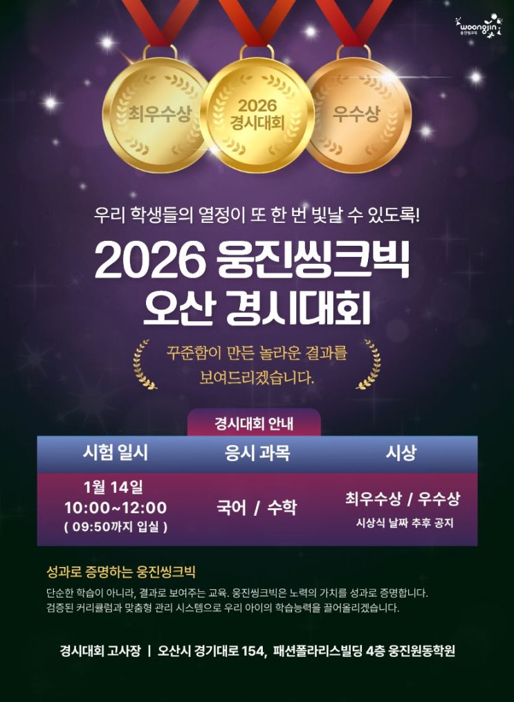 우리 학원에서는 학생들의 학습 성취도 점검과 도전 의식·자신감 향상을 위해 ✨ 학원 경시대회 ✨를 진행합니다. 경시대회, 왜 참여해야 할까요? ✔️ 현재 실력을 객관적으로 확인 ✔️ 학교 시험 대비 실전 감각 향상 ✔️ 목표 설정과 성취 경험 제공 ✔️ 우수 학생 시상 및 혜택 제공 단순한 시험이 아닌, 성장하는 계기가 되는 대회입니다! 원동 학원 경시대회 진행 후기 & 소감 지난 1월 14 일, 많은 학생들의 참여 속에 학원 경시대회를 무사히 마무리했습니다. 이번 경시대회는 학생들의 ✔️ 학습 이해도 점검 ✔️ 문제 해결력 향상 ✔️ 도전 의식과 자신감 강화 를 목표로 진행되었습니다. ✏️ 진지하게 임한 우리 아....... <img src="https://blogthumb.pstatic.net/MjAyNjAxMTVfMTcy/MDAxNzY4NDc2MTQyNDYx.I-i5kT0oPloKUXca6kwO9jZ6QqlyuR4DNX3WnDtvyd0g.iP0pItRZie1sH2u_g_A0tlLegvtrp1StxKW--AMOOV4g.JPEG/1768301557224.jpg?type=s3" />