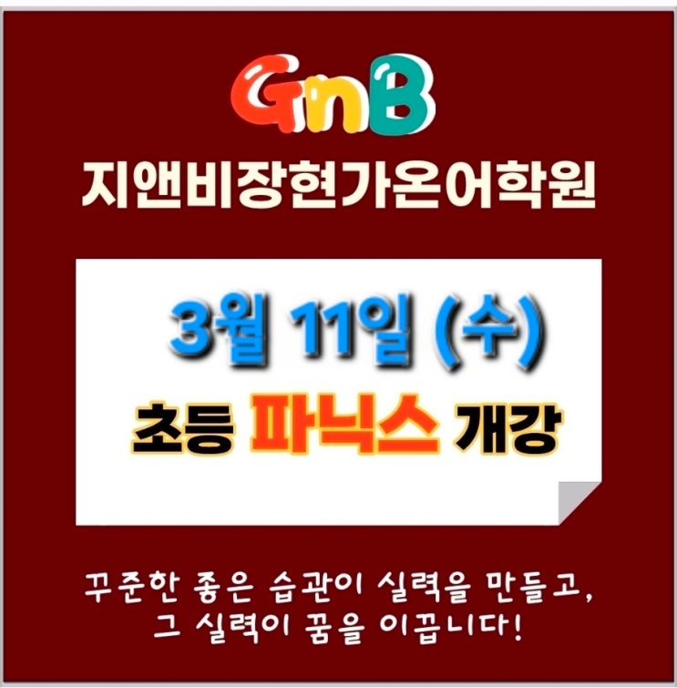 초등 영어 파닉스 및 예비 초등영어 전문, 지앤비장현가온어학원입니다. 새로운 학기를 앞두고 우리 아이의 첫 영어 시작을 고민하시는 학부모님들께 기쁜 소식을 전해드립니다. 2026년, 장현지구 지앤비장현가온어학원이 그동안 많은 요청이 있었던 초등부 파닉스반을 전격 신설합니다. 단순히 지식을 전달하는 곳을 넘어, 아이들이 머무는 공간의 쾌적함까지 진심을 다해 준비했습니다. 왜 장현동초등영어의 시작은 '파닉스'여야 할까요? 영어라는 낯선 언어를 처음 만나는 아이들에게 가장 필요한 것은 '자신감'입니다. 단어를 무작정 외우기보다 소리와 글자의 규칙을 스스로 깨우치는 파닉스 단계는 평생 영어 실력의 8....... <img src="https://blogthumb.pstatic.net/MjAyNjAyMDhfMjU2/MDAxNzcwNDg3OTM3ODc4.TMT5i2rutCF-v6o2bKahpJP31C9_GzIQItQ-1ekBoxwg.xMGQvalwtst2wW2V2QWgJIYMMHzMzH3geqfeZDn9Bq0g.JPEG/900%A3%DF1770487936676.jpeg?type=s3" />