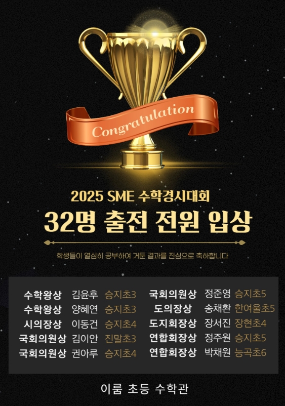 특별상 및 주요 기관장상 수학왕상: 김O후(승지초3), 양O현(승지초3) 국회의원상: 김O안(진말초3), 권O루(승지초4), 정O영(승지초5) 시의장상: 이O건(승지초4) 도의장상: 송O환(한여울초5) 도지회장상: 장O진(장현초4) 연합회장상: 정O원(승지초5), 박O원(능곡초6) 금상 (Gold Prize) 조O안 (한여울초3) / 이O안 (진말초5) / 신O윤 (능곡초6 ) 장O혁 (진말초6) / 박O은 (계남중2) 은상 (Silver Prize) 신O우 (능곡초5) / 김O준 (능곡초5) / 강O영 (승지초6) 동상 (Bronze Prize) 민O아 (승지초5) / 성O람 (승지초5) / 김O주 (승지초5) / 김O재 (승지초6) 권O라 (승지초6) / 안O우 (능곡중1) / 권O현 (능곡중1) ️ 장려상....... <img src="https://blogthumb.pstatic.net/MjAyNjAyMTFfNjMg/MDAxNzcwNzY1NzA4OTg2.6Q3eqbEY3lFAIb0hzNAwNWnerwGlbLt2qbyC2kokv2kg.sv-dNJwJ4Q_rQmrLGzv7rzzMEjQNI_DaZBZvfP8Pu8Yg.JPEG/%BC%F6%C7%D0%BF%D5%BB%F3_-_%B1%E2%B0%FC%C0%E5%BB%F3_1-3.jpg?type=s3" />