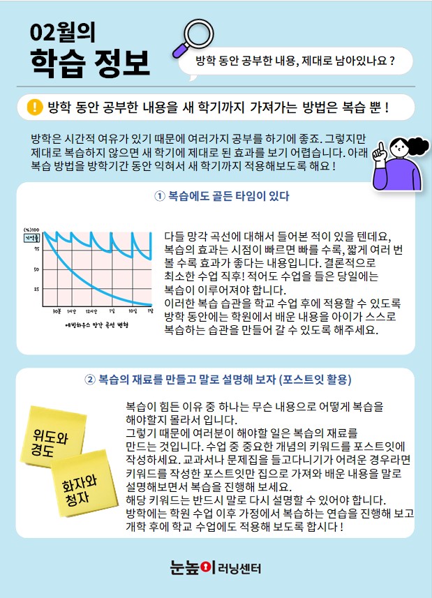 2월 눈높이러닝센터 주요 일정 안내 안녕하세요 눈높이러닝센터 2월 주요 일정과 다양한 행사 소식을 안내드립니다! 새 학기를 준비하는 중요한 시기인 만큼, 아이들의 실력 점검과 즐거운 이벤트가 가득한 한 달이 될 예정입니다 1. 1월 러닝센터 이야기 – 무비데이 & 어묵데이 & 수능챌린지 1월에는 아이들과 함께 즐거운 무비데이와 따뜻한 어묵데이를 진행했습니다 친구들과 함께 영화를 보고 간식을 나누며 즐거운 시간을 보냈어요. 또한 수능 챌린지를 통해 스스로 목표를 세우고 도전하는 의미 있는 시간도 가졌습니다. 열심히 참여해 준 우리 친구들 모두 최고였습니다 2. 새 학기....... <img src="https://blogthumb.pstatic.net/MjAyNjAyMTFfODkg/MDAxNzcwODA1OTI4MTE3.zw3q6pkDpwd8MeTyUr5H05_reeKUBoWwO7T-c2LCpaMg.oblgZAO1fzj9VemWmrqIdfpYtkt0OIG1M15gw34Hw78g.JPEG/%C8%AD%B8%E9_%C4%B8%C3%B3_2026-01-30_150150.jpg?type=s3" />