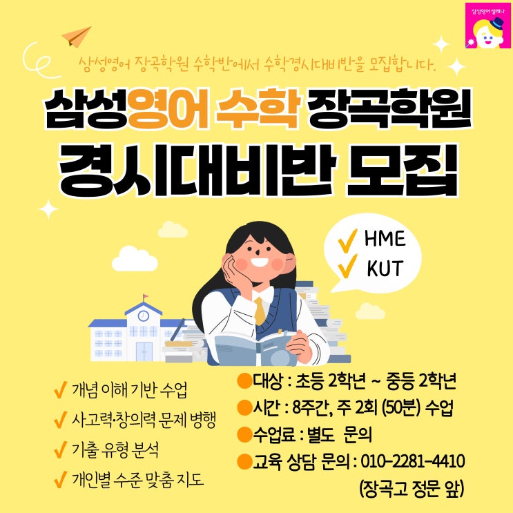 안녕하세요. 삼성영어 장곡학원 수학반입니다. ^^ 다가오는 2026 상반기 수학경시대회를 대비하여 우리 학원에서는 수학경시대회 대비반을 모집합니다! 우리 학원이 준비하는 수학경시대회 시험은 HME, KUT 입니다. 삼성영어 장곡학원 수학반의 경시 준비 방향 ✔ 개념 이해 기반 수업 ✔ 사고력·창의력 문제 병행 ✔ 기출 유형 분석 ✔ 개인별 수준 맞춤 지도 아이에게 부담이 되지 않도록 실력에 맞는 단계별 경시 준비를 진행합니다. 경시대회는 아이를 ‘경쟁시키기 위한 시험’이 아니라 아이의 가능성을 발견하고 키워주는 성장 과정입니다. 초등 시기의 작은 도전이 중·고등 수학 실력의 큰 차이를 만들어냅니다. 대상 : 초등 2학년 ~ 중....... <img src="https://blogthumb.pstatic.net/MjAyNjAzMTdfMTM2/MDAxNzczNzI4MzY4NjMz.mPXZHKSvl4U1te2jdcHuqnwJH5YFrUQDWQVrzthHhXIg.ZL_g5D_2wiFnpYNk_xsa84pulQZFmkJjvaf30ON6buQg.JPEG/%C1%A6%B8%F1_%BE%F8%B4%C2_%B5%F0%C0%DA%C0%CE_%2824%29.jpg?type=s3" />