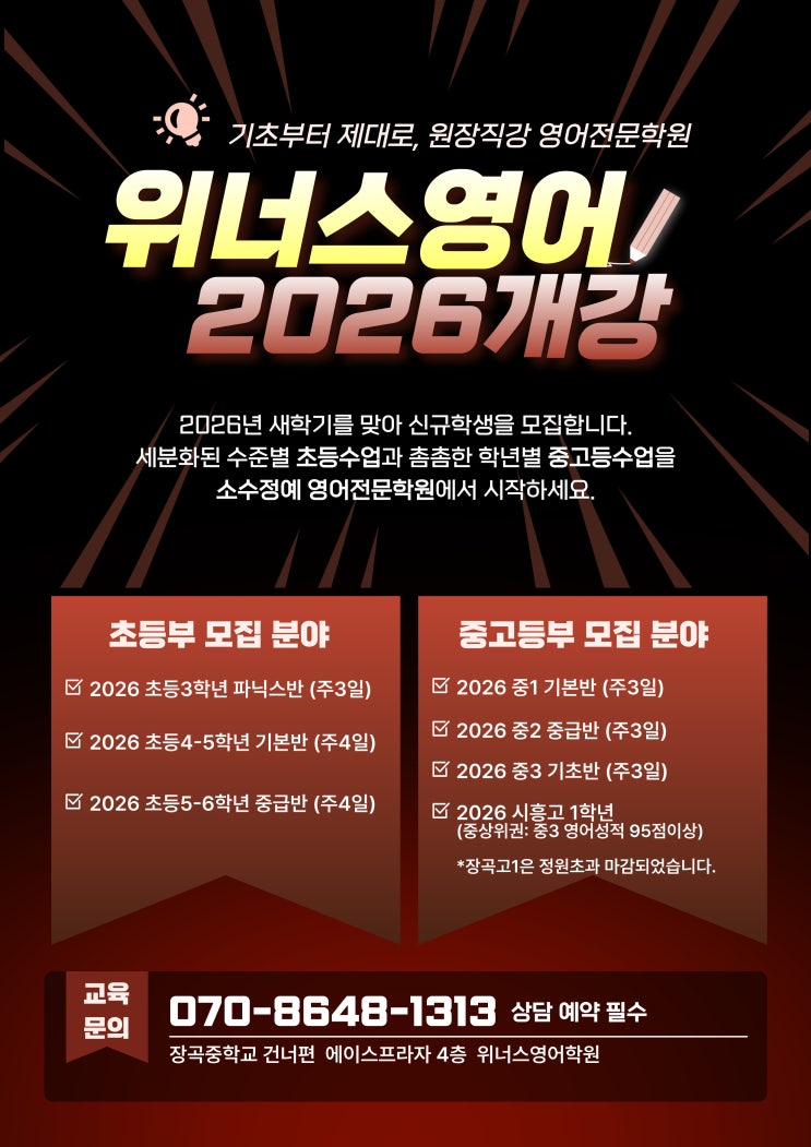 [위너스영어학원] 2026년을 앞두고 장곡동 영어전문학원 [위너스영어학원]에서 신입생을 모집합니다. 원장이 직접 지도하고 관리하여 수준높은 수업 퀄리티가 지속적으로 유지되고 기초부터 제대로 영어의 4대영역을 골고루 학습하는 [위너스영어학원]에서 시작하세요. [위너스영어학원]은 장곡중학교 건너편에 위치해 있습니다. 커리큘럼 안내 및 상담 문의 070-8648-1313 <img src="https://blogthumb.pstatic.net/MjAyNTEyMTlfMjUg/MDAxNzY2MTIyMTk5NjMx.-C7MetBhAhHtYzCeYLvTPqt7BW6Pt4a8Q6OomaITuvkg.9p9uhlrZi9d6eniq4O5uvKTUG8ny2bQxMSijGeLihisg.JPEG/%C1%A6%B8%F1%C0%BB-%C0%D4%B7%C2%C7%D8%C1%D6%BC%BC%BF%E4_-001_%2817%29.jpg?type=s3" />