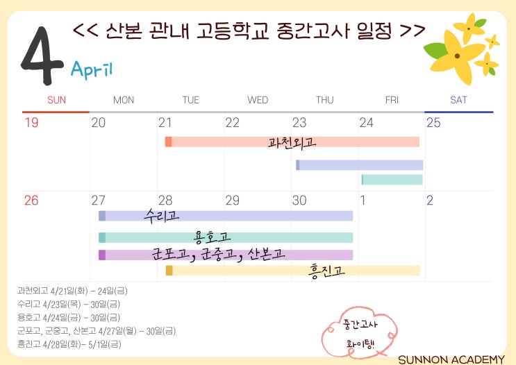 안녕하세요, 수논수학학원입니다! 새학기에 적응한 지 얼마 되지 않은 것 같은데 벌써 중간고사가 다가왔네요 :) 시간이 정말 빠르게 느껴집니다. 수논수학학원에서는 산본 관내 고등학교 중간고사 일정을 정리해 안내드리려고 합니다. 과천외고 4/21일(화) - 24일(금) 수리고 4/23일(목) - 30일(금) 용호고 4/24일(금) - 30일(금) 군포고, 군중고, 산본고 4/27일(월) - 30일(금) 흥진고 4/28일(화)- 5/1일(금) ※ 흥진고의 경우 5월 1일 시험 일정이 포함되어 있으나, 공휴일 지정으로 인해 일정이 변동될 수 있으니 정확한 일정은 학교 공지를 꼭 확인해 주시기 바랍니다. 문의사항은 학원으로 전화 혹은 카카오톡 채널을 이용해 주세요~ [Kaka....... <img src="https://blogthumb.pstatic.net/MjAyNjAzMjVfMjU4/MDAxNzc0NDQyMjM4MjEw.k3r7h59fhtE_KXdiwg8ESzZMMoQ7g-zxY8tU32-2gGEg.2XzVBTP3Cx3VxAdOVo9UVDkFIbocD7HrmxhpfBFmQkIg.JPEG/26%B3%E2-%B3%BB%BD%C5%C0%CF%C1%A4-002.jpg?type=s3" />