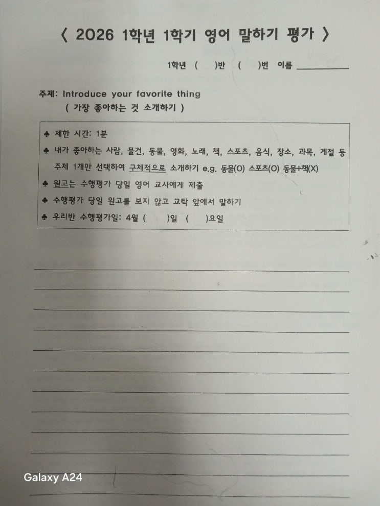 2026 흥덕중학교 1학년 1학기 영어 수행평가