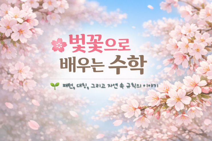 안녕하세요 여러분~ 어느덧 4월이 되고 주변엔 꽃들이 피어나는 따뜻한 봄날이네요 오늘은 예쁜 벚꽃 속에서 재밌게 배울 수 있는 수학이야기를 해보려고 해요! 패턴, 대칭, 그리고 자연 속 규칙의 이야기 따뜻한 봄이 오면 거리 곳곳에 벚꽃이 피어납니다. 이 벚꽃 속에도 사실은 수학이 숨어 있다는 것, 알고 계셨나요? 벚꽃 속에는 ‘패턴’이 있습니다 벚꽃을 자세히 보면 꽃잎이 일정한 규칙으로 배열되어 있습니다. ✔ 반복되는 형태 ✔ 일정한 간격 ✔ 비슷한 구조의 반복 이런 특징은 수학에서 말하는 **패턴(규칙성)**입니다. 수학은 단순히 숫자를 계산하는 것이 아니라, 이처럼 규칙을 발견하는 학문입니다. 자연은 스....... <img src="https://blogthumb.pstatic.net/MjAyNjA0MDFfMzcg/MDAxNzc1MDQ1NDU0NDEx.3Bo0-S7WvyUqA-jolXcMT1R2aCT4HXMEuJJw_4T_wt8g.Wqgz0jdAncx1nU5CCeGM6boB6sGbdRCyK22NrDfk8JYg.PNG/900%A3%DFfile%A3%DF000000003a60720bb8a8ee640ce3f537.png?type=s3" />