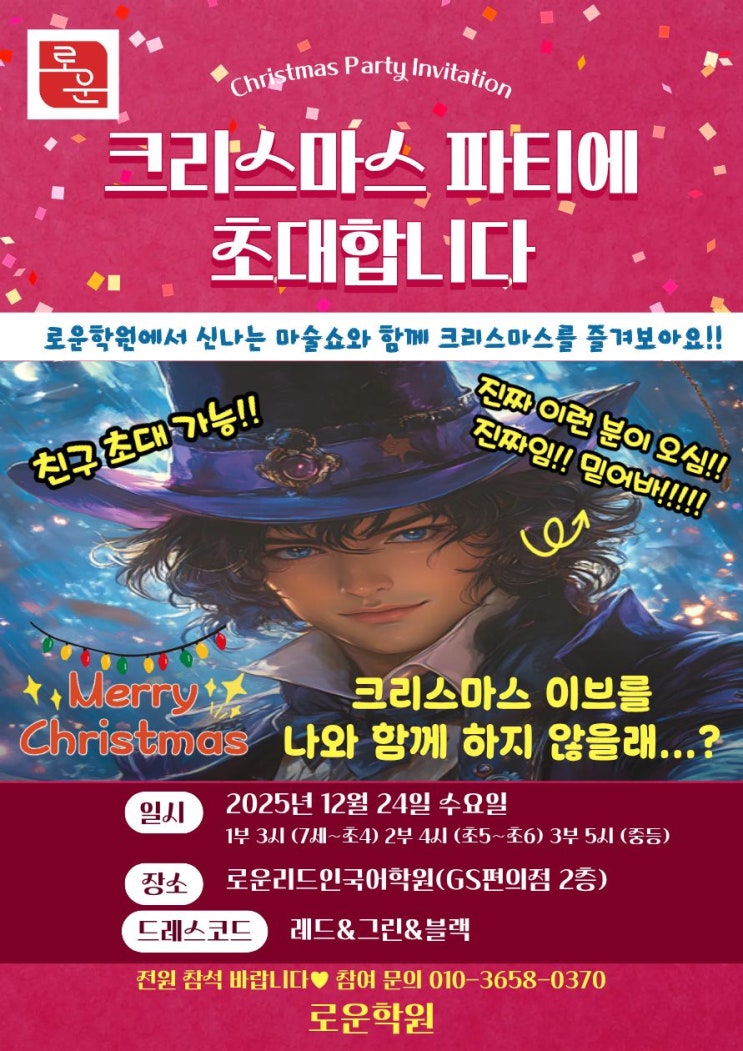아이들이 즐거워하는 여러날 중에 하루!! 크리스마스가 코 앞입니다! 이 날은 스트레스 없이 즐거운 시간 보내며 즐길 수 있도록 이벤트를 준비했습니다. 재원생은 물론 동생,언니,오빠,형,누나 상관없이 참여가능합니다. 예쁜 울애기들 사진을 위해 드레스코드도 넣어봤어요. 마술쇼와 간식,선물,베스트드레서 투표와 장기자랑의 시간(희망자) 그리고 사진촬영까지 끝까지 알차게 즐겨보겠습니다 행사 일정 참고 하셔서 전원 참석 가능하도록 부탁드립니다. 문의 010-3658-0370 ㆍ #로운학원 #상하동 #국어 #영어 #수학 #독서 #논술 #학원 #상하초등학교 #상하중학교 #성지중학교 #미래엔수학 #삼성영어셀레나 #리드인독서논술 <img src="https://blogthumb.pstatic.net/MjAyNTEyMTFfMjc1/MDAxNzY1NDU4OTAwMTcy.Py4iRZDKOn3LLLDNvhvjreWyLztMe67qPRNeHqbamM0g.VkwhocOt4UL2CNBtBBLVNkXfyI4dENdzYL0SfR3De8Yg.JPEG/1765436494233.jpg?type=s3" />