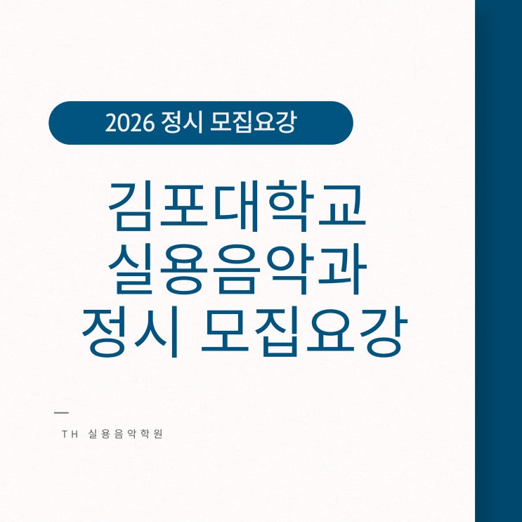 안녕하세요! TH실용음악학원입니다! 오늘은 김포대학교 실용음악과 2026 정시 모집요강에 관해 안내드리겠습니다. 전형 일정 원서접수는 2025.12.29~2026.1.14일까지 받고있습니다. 실기고사 일정 시험 시간은 2026.1.20 화요일에 홈페이지에서 확인할 수 있으며 시험은 2026.1.22~1.24일까지 진행됩니다. 모집 인원 일반전형 - 5명 미래융합계열 내 전문대졸업 - 1명 재외국민 및 외국인 (2호) - 3명 재외국민 및 외국인 (7호) - 1명 북한 이탈자, 순수 외국인 - 1명 응시자격 및 제출서류 성적 반영 비율 실기고사 내용 2025 정시 경쟁률 합격자 발표일 2026.1.30 금요일에 학교 홈페이지에서 확인하실 수 있습니다. 정시에서는 모집인원이 많....... <img src="https://blogthumb.pstatic.net/MjAyNTEyMTdfMjYy/MDAxNzY1OTc3NTY3MDg3.cwGxC3jdA5tRwY_hdfeE5s7HQzYbLu8fGt4eZY2eIq8g.rPK86wTprl4p0DxRpKs-jfskz4qWhpIcXKzbrerSM3Yg.JPEG/%C1%A6%B8%F1%C0%BB-%C0%D4%B7%C2%C7%D8%C1%D6%BC%BC%BF%E4_-001-2.jpg?type=s3" />