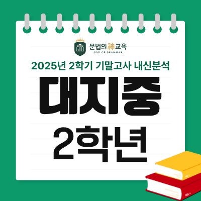 안녕하세요. 결과로 말하는 문법 전문 교육기관, 문법의신교육입니다. 시험을 앞둔 가장 중요한 순간, 최적의 학습 방향을 제시합니다. 문법의신교육은 시험 직전 보강 수업을 통해 최신 기출 경향을 반영한 핵심 대비 학습을 제공하고 있으며, 학생 개개인의 수준과 취약점을 고려한 맞춤형 전략 지도로 실질적인 성과와 성장을 이끌어내고 있습니다. 대지중 2학년 직전보강 대지중 2학년 기말고사 분석 문법의신교육은 학생의 잠재력을 극대화하기 위해 정교한 분석과 맞춤형 학습 전략을 제공합니다 시험 범위 안내 ◆ 시험 범위 : 능률 김성곤 7-8과, 외부지문 6개 ◆ 평가 형태 : 객관식 20문항, 논술형 2문항 대지중 2....... <img src="https://blogthumb.pstatic.net/MjAyNTEyMThfMjk1/MDAxNzY2MDM5ODM4ODky.-zLcvnjAk0F4w9B1wfe-BrfrlBbXhRiBiIB2RuTBKqMg.n7puhEFzSH21U0XYT5ljmmPMrR69JuWCWuRRxta80Zsg.JPEG/%C1%DF%B5%EE%BA%CE_2025_2%C7%D0%B1%E2_%B1%E2%B8%BB_%BD%E6%B3%D7%C0%CF_250919_%B3%BB%BD%C5%BA%D0%BC%AE_%BD%E6%B3%D7%C0%CF_5.jpg?type=s3" />