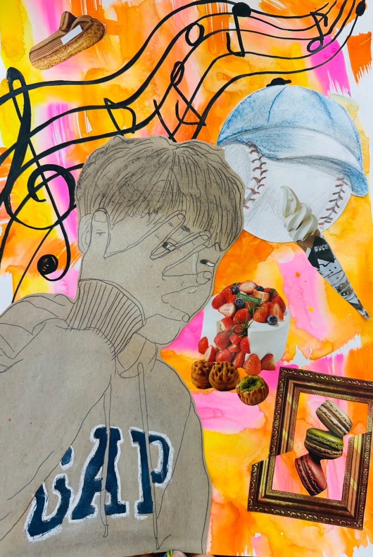 자화상 콜라주 – 나를 담아내는 시간 이번 수업은 단순한 자화상이 아닌, 아이의 기억과 감정, 취향까지 함께 담아내는 콜라주 자화상 작업으로 진행되었습니다. 따뜻하게 번지는 오렌지빛 배경 위에 차분하게 자리 잡은 얼굴, 그리고 그 주변을 채우는 다양한 이미지들은 아이의 내면과 이야기를 조용히 드러냅니다. 무엇을 좋아하는지, 어떤 기억을 간직하고 있는지, 그리고 어떤 분위기를 가진 아이인지까지 자연스럽게 느껴지는 작품이었어요. 1년 만에, 잠시 머물다 간 특별한 시간 사우디에서 지내다 1년 만에 한국에 잠시 들어온 학생이에요. 전세기를 타고, 정말 짧은 일정 속에서 단 일주일, 미술을 하기 위해 시간을 내어 학....... <img src="https://blogthumb.pstatic.net/MjAyNjAzMjBfMjA0/MDAxNzc0MDE2MDI2MDI4.dn6ReDq7QGKip09_PLUij_LbIdM3uksS3luPnQliKOsg.tjxlLty2-jC2hpNHxQt_KUJ3OIS5c7H6VKBsqHedv_4g.JPEG/IMG_8668.JPG?type=s3" />