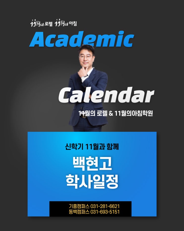 안녕하세요 용인시 기흥구에 위치한 백현고등학교의 수학, 영어, 국어, 과학을 가르치고 있는 11월의로렐&아침학원입니다. 오늘은 백현고 26년 1학기 중간, 기말고사 일정을 포함한 주요학사일정을 안내해드리도록 하겠습니다. 백현고 26년 1학기 학사일정 -. 중간고사 : 26년 4월 23일(목)~4월 28일(화) -. 기말고사 : 26년 6월 25일(목)~7월 1일(수) ◐2. 주요학사일정1 -. 학부모총회 : 26년 3월 19일(목) -. 3월모의고사 : 26년 3월 24일(화) -. 5월모의고사 : 26년 5월 7일(목) -. 6월모의고사 : 26년 6월 4일(목) _ 평가원 -. 7월모의고사 : 26년 7월 8일(수) -. 방학식 : 26년 7월 21일(화) ◐3. 주요학사일정2 -. 재량휴업일 : 26년....... <img src="https://blogthumb.pstatic.net/MjAyNjAzMjBfMyAg/MDAxNzczOTg3MzIyNTY1.Vz8mP3wJgRzEtNS0l6Sm2ZKOOaNYPjDRqQeo2QdLErYg.Tp2GjtqiiBuOChLm74qSHcL7gh3FdYEL_cpAb6LqkUkg.JPEG/%B9%E9%C7%F6%B0%ED%C7%D0%BB%E7%C0%CF%C1%A41.jpg?type=s3" />
