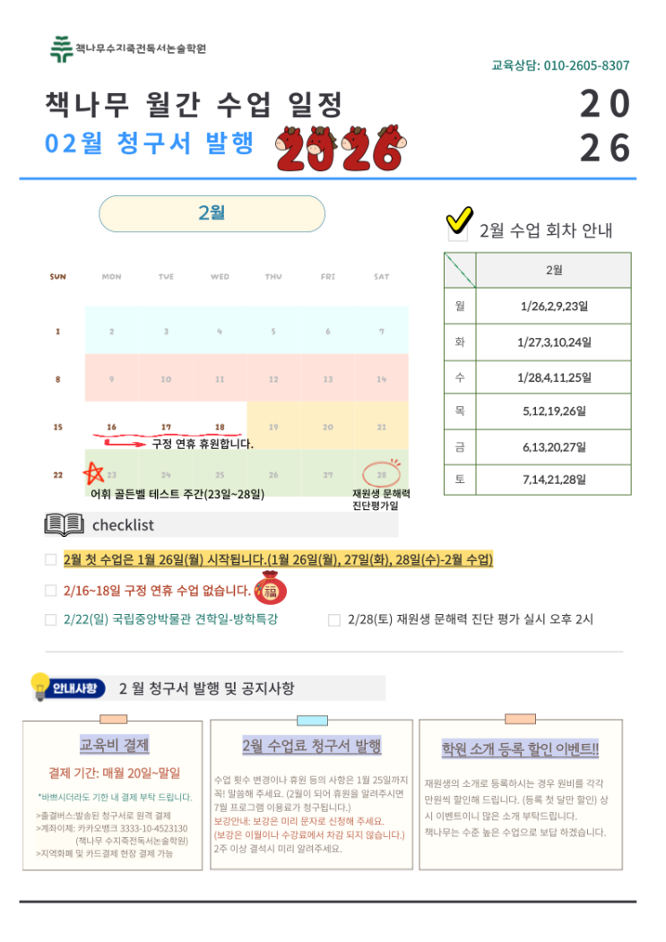 책나무 수지죽전독서논술학원 2월 공지사항 안녕하세요, 책나무 수지죽전독서논술학원입니다. 2월 수업 일정과 주요 안내사항을 전해드립니다. 1. 2월 수업 일정 안내 ☞수업 기간: 1월 26일(월) ~ 2월 28일(토) / 총 4주 ☞설 연휴 휴원: 2월 16일(월) ~ 2월 18일(수) ☞구정 연휴로 인해 1월과 2월 수업 일정이 맞물려 있어 혼란스러우실 수 있습니다. 일정 관련 문의는 언제든 책나무 수지죽전점 카카오채널로 상담 요청해 주세요. http://pf.kakao.com/_PxlDwn 2. 2월 수업료 청구서 발행 및 납부 안내 청구서 발행일: 1월 20일 출결 관리 프로그램 변경: 랠리즈 → 출결버스 어플 설치의 번거로움을 줄이고 효율적인 관....... <img src="https://blogthumb.pstatic.net/MjAyNjAxMjBfMjU2/MDAxNzY4ODk1MDgwNjMw.2zm3Wat3LDLhVhZTziljEVP5jSIb4LGR6gWsZcx2TAYg.a2w5dnE4Q7Cx20OwTmbxf9L33QXskZMRGOtWO8jqAvgg.PNG/%C1%A6%B8%F1%C0%BB-%C0%D4%B7%C2%C7%D8%C1%D6%BC%BC%BF%E4_-001_%284%29.png?type=s3" />