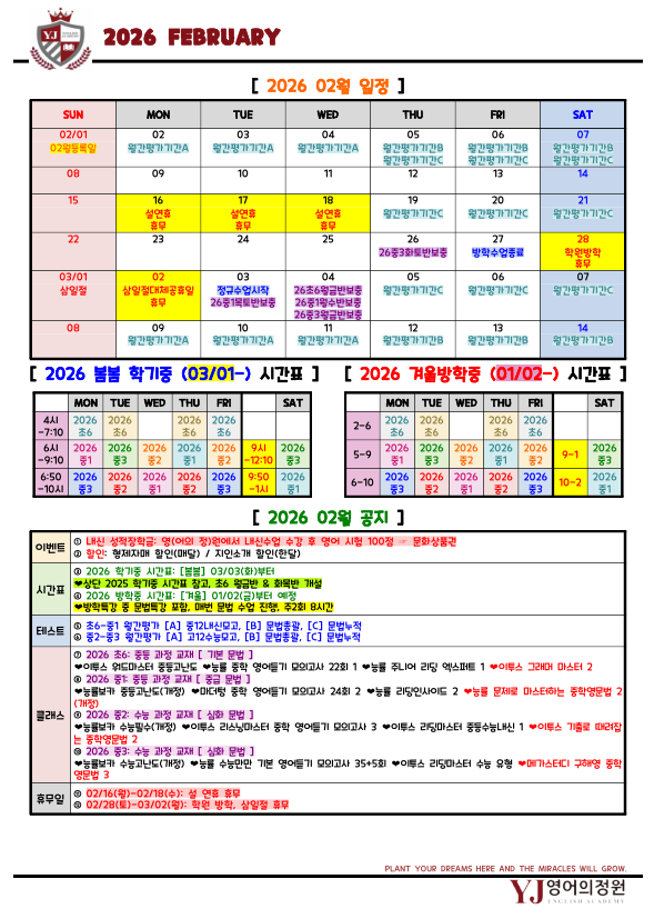 새 학년을 앞둔 지금, 먼저 점검해야 할 것들 2월은 무언가를 더 시작하기보다, 우리 아이의 영어가 다음 학년을 버틸 수 있는 상태인지 먼저 점검해야 할 시기입니다. 영어 실력은 단기간에 만들어지지 않습니다. 초중등 시기에 만들어진 읽는 습관과 학습 태도는 고등 영어, 나아가 수능까지 이어지는 가장 중요한 기반이 됩니다. YBM잉글루는 학년별로 반드시 필요한 영어 기초를 개별 수준에 맞추어 점검하고, 아이들이 다음 단계를 흔들리지 않고 올라갈 수 있도록 지금 꼭 필요한 학습 방향을 설계합니다. 새 학년을 앞둔 지금, 아이의 영어 학습 방향을 한 번 더 점검해 보세요. 차이를 만드는 영어 습관, YBM잉글루 파닉스부터 중등내신....... <img src="https://blogthumb.pstatic.net/MjAyNjAyMDNfOCAg/MDAxNzcwMDk1MTU1Mzky.Mf8I0H4R3fwowOUi9xen8GQr1ij0Cp8aYzJGh64sLDUg.RRO95a31upHMbhKHqlH6856cxVPzQH0auXxXr500_Nsg.JPEG/IMG%A3%DF6489.JPG?type=s3" />