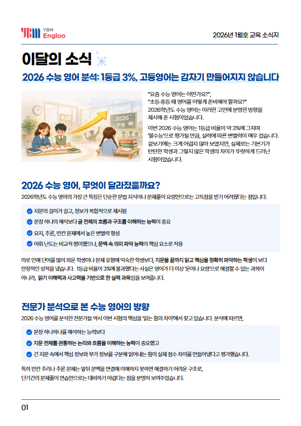 안녕하세요~ YBM 아이비스카이입니다. YBM 잉글루 2026년 1월 교육 소식지는 2026년 수능영어 분석입니다. "요즘 수능 영어는 어떤가요?" , "초등 및 중등 때 영어를 어떻게 준비해야 할까요?" 2026학년도 수능 영어는 이러한 고민에 분명한 방향을 제시해 준 시험이었습니다. 이번 2026 수능 영어는 1등급 비율이 약 3%에 그치며 '불스능'으로 평가될 만큼, 실력에 따른 변별력이 매우 컸습니다. 겉보기에는 크게 어렵지 않아 보였지만, 실제로는 기본기가 탄탄한 학생과 그렇지 않은 학생의 차이가 뚜렷하게 드러난 시험이었습니다. 2026 수능영어, 무엇이 달라졌을까요? 2026학년도 수능 영어의 가장 큰 특징은....... <img src="https://blogthumb.pstatic.net/MjAyNjAxMjlfMTY3/MDAxNzY5NjgzNzM1MDAx.x-AP3iaCOOrme7uMjWggcpuZ6xTu6IJmfLJsV-IRH3Yg.KrM4VwVEgXZaoRJlcF2cOecjzNsZbBdDflcNsEQZOtsg.PNG/%BC%D2%BD%C4%C1%F62026%B3%E2_1%BF%F9%C8%A3_1.png?type=s3" />