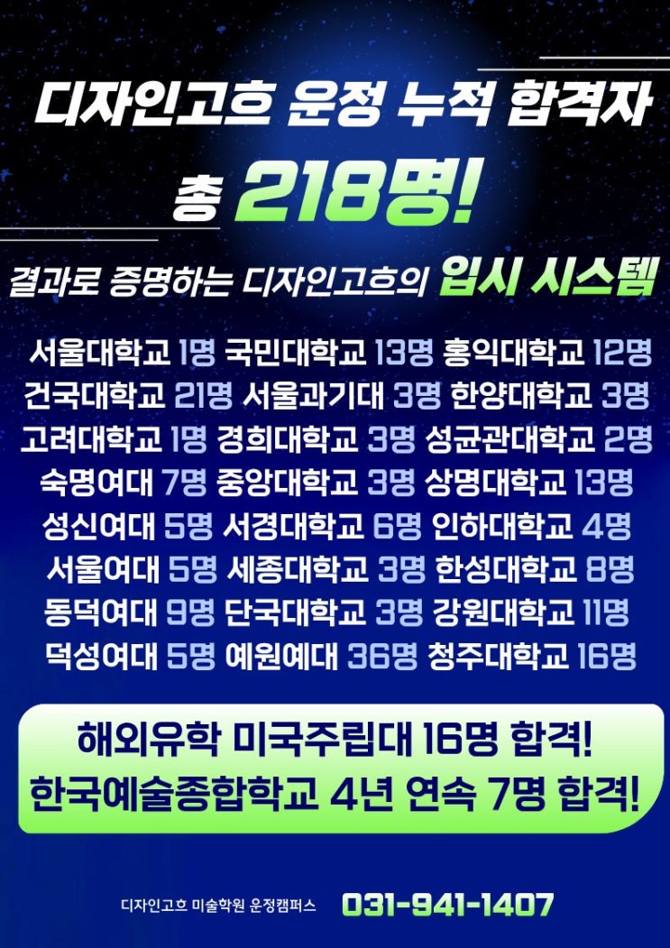 안녕하세요 디자인고흐 미술학원 운정캠퍼스입니다. 오늘은 3/28일 진행되는 운디고 입시설명회를 안내드리려고 합니다. 미대 입시는 단순한 실기 실력만으로 결정되지 않습니다. 전략과 정확한 방향이 있어야 합니다. 아이의 입시를 준비하면서 “지금 제대로 준비하고 있는 걸까?” 고민하고 계신 학부모님이라면 꼭 확인해보셔야 합니다. 이번 설명회에서는 ✔ 2027학년도 미대 입시의 핵심 흐름 ✔ 학교별 출제 유형 및 합격 전략 ✔ 수시·정시 맞춤 대비 방법 ✔ 면접, 포트폴리오, 해외 유학 준비 방향까지 실제 합격으로 이어지는 구체적인 방법을 안내드립니다. 또한, 누적 합격자 218명이라는 결과로 증명된 운정캠퍼스의 입시 시스템을....... <img src="https://blogthumb.pstatic.net/MjAyNjAzMjFfMjU2/MDAxNzc0MDc2NDU3MzQ5.CRHK4wyLnjfKap7fop33Nmoihl8KGxQ5fWkrHUbtj10g.Lilq086W4HTjIgcRTEkFX07mbnBy_YOrM3e7IfuHLCUg.JPEG/%C0%D4%BD%C3%BC%B3%B8%ED%C8%B8_%281%29.jpg?type=s3" />