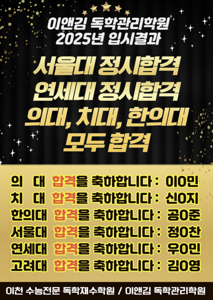 이천 수능전문 독학재수학원 이천 이앤김 독학관리학원 2025년 입시 결과입니다. 2018년 개원하여 지금까지, 매년 실제 합격 결과를 통해 증명해왔습니다. 7년 연속 의대 합격 7년 연속 SKY 합격 2년 연속 정시 서울대 합격 (모든 입시결과는 투명하게 블로그에 공개되어있습니다.) 수시와 정시 모두에 강한 학원, 8년간 전좌석 마감 이천 이앤김 독학관리학원입니다. 이천독학재수학원 이앤김 독학관리학원 2025년 입시 결과 의대 합격 ✨️ 이O민 치대 합격 ✨️ 신O지 한의대 합격 ✨️ 공O준 서울대 합격 ✨️ 정O찬 연세대 합격 ✨️ 우O민 고려대 합격 ✨️ 김O영 서강대 합격 ✨️ 김O빈 중앙대 합격 ✨️ 김O원 중앙대 합격 ✨....... <img src="https://blogthumb.pstatic.net/MjAyNjAyMDFfMTQw/MDAxNzY5OTUwNTc2NTY5.QQMJySVEhxs4SrTXyHCD8KQ_8bBeNJS9GbPc9D3ZYeUg.jjhBomzq2sd3OJjHBnxe2Gm_m5VRZ4Sp4ji5cJh6Uvkg.PNG/image.png?type=s3" />