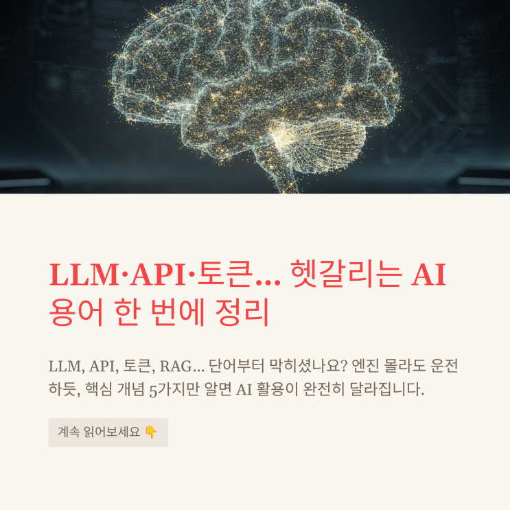 AI 용어, 어렵게 말하지만 핵심은 5개면 끝납니다 AI를 처음 접하는 분들과 이야기하다 보면 가장 먼저 막히는 부분이 있습니다. 바로 ‘용어’입니다. LLM, API, 토큰, RAG… 이 단어들이 한 번에 나오기 시작하면 내용보다 단어부터 막히게 됩니다. 그런데 중요한 건 이걸 전부 깊게 이해할 필요는 없다는 점입니다. 운전을 할 때 엔진 구조까지 몰라도 되지만 엑셀과 브레이크는 알아야 하듯이, AI도 핵심 개념 몇 가지만 알면 활용 수준이 완전히 달라집니다. 오늘은 AI를 활용해 업무를 하거나 수익을 만들고 싶은 분들이 꼭 알아야 할 핵심 용어 5가지를 쉽게 정리해보겠습니다. LLM : AI의 ‘두뇌’ LLM은 “Large Language Model”의 약....... <img src="https://blogthumb.pstatic.net/MjAyNjA0MDNfMjkg/MDAxNzc1MTU0OTY1MDY5.CiCDsOOFK28PosCpeDk3azi-ITv6UEwwidpLOuS5eLAg.D5n3l0U0OO6oCRoX5Q6KoTREzlowusO0yy4Yg4wFmTMg.PNG/1_LLMAPI-AI.png?type=s3" />