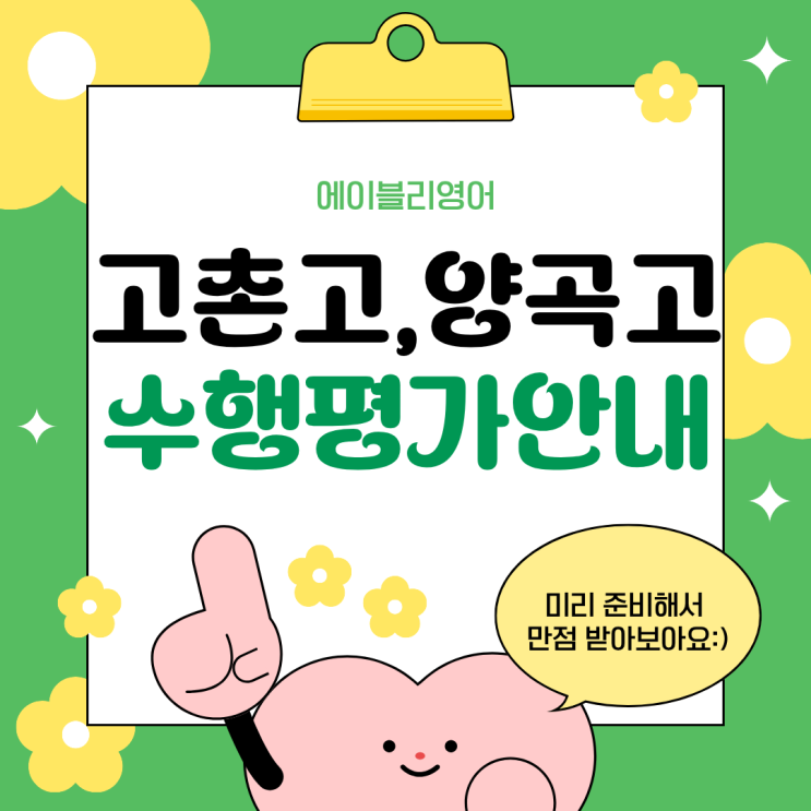 안녕하세요, 에이블리영어입니다! 중간고사 준비로 한창 바쁜 요즘, 고촌고와 양곡고 1학년 학생들에게 또 하나의 큰 산인 영어 수행평가 시즌이 돌아왔습니다. 수행평가는 내신 성적의 큰 비중을 차지하는 만큼, 전략적인 준비가 필수적이죠. 우리 에이블리영어에서 각 학교별 수행평가 공지 내용을 완벽하게 분석해 드립니다. 학생 여러분은 이 가이드를 따라 차근차근 준비해 보세요! 고촌고등학교 시험 일시: 2026년 4월 6일(월) ~ 4월 7일(화) 중 첫 번째 수업시간 ⏱ 시험 시간: 40분 ✏️ 분량: 150단어 이상 주의: 휴대폰, 사전, 기타 전자기기 사용 금지 (2차 공지) 시험 당일 아래 항목들을 모두 충족해야 해요. 미리 확....... <img src="https://blogthumb.pstatic.net/MjAyNjA0MDVfMjI1/MDAxNzc1Mzc4OTg1MzY3.IGS7gZ5jzH_oxSkTNmpCPieo3gXeGjUHt9Uj7YPkKHAg.iEHil_kHJ9hXOxX2LbEPQNaddu8CjHfTIHmGziSrVFsg.PNG/%B0%ED%C3%CC%B0%ED%BE%E7%B0%EE%B0%ED%BC%F6%C7%E0.png?type=s3" />
