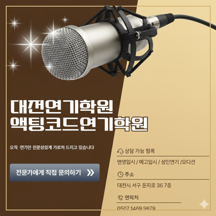< 대전연기학원 성인 청소년 입시 학원 액팅코드 > 연극영화과 입시.. 사실 열정만으로는 부족한데요. 연극영화과 입시를 준비하며 설렘, 막막함 두 가지 감정이 있으실 거예요 하지만 액팅코드 연기학원을 만나는 순간! 여러분들의 인생의 터닝포인트가 터지는 순간이실 테니 주목해주세요 매년 수많은 학생들이 배우라는 꿈을 향해 달려가고 있는데요 냉정하게 말씀드리자면 연극영화과 입시는 열정만으로는 힘든 분야이에요 실기가 거의 80%나 차지하는 학교들도 꽤 있을 정도로 내신보다는 실기인데 내신 비율이 낮은 대신 실기를 정말 그만큼 잘 해야 합니다!! 액팅코드 연기학원은 입문자부터 시작해서 다시 한 번, 인생의 끈을 하나....... <img src="https://blogthumb.pstatic.net/MjAyNTEyMThfMjE2/MDAxNzY2MDYzOTcxODk5.72n4Ovt_liY2E9bAQmPB53CZDlpI8FOTxxP5Ut0nc9wg.XDkSJxCJAeE7fEVLts40yXvR5IB_iBSETC-SI9828IUg.PNG/Gemini_Generated_Image_d0iovad0iovad0io.png?type=s3" />