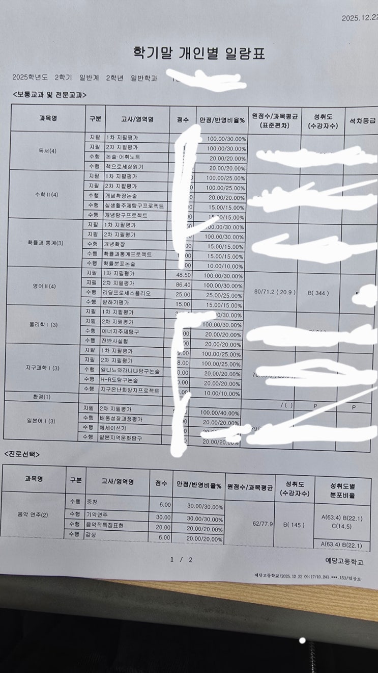 이번 로로파에서 처음 시험을 본 아이가 성적표가 나왔다고 너무 기뻐하며 보내줬네요. 고등학교 성적 올리는게 쉽지 않기에 저희 학원은 아이들 각자의 목표 점수를 세워 그에 최대한 근접할 수 있도록 지도 하고 있습니다. 물론 이번 시험이 난이도는 좀 쉬운 편이였지만 시험 기간에 아파서 결석을 해서 주말에 보강을 열심히 시킨 아이가 40점 이상 가까이 성적향상을 일궈내서 너무 칭찬해 주고 싶네요. 이 아이의 경우를 보면 영어에 흥미를 잃어버린 아이들도 조금만 마음을 바꿔서 노력하면 바라던 목표를 달성 할 수 있다는 계기를 만들어 주는 것 같습니다. 반 별로 달라서 내일 성적표 나오는 학급도 있다고 하네요. 예당고 모든 아이....... <img src="https://blogthumb.pstatic.net/MjAyNTEyMjJfMjAz/MDAxNzY2Mzk3NDE5NjU1.toLM5-GBgBs-INZ-L9owsJge7ruXBeevGgo3d0jxRNMg.ZiGXL5KExXxKXot_ezk4JvcGjfEFSuauiP8THQ-65m4g.JPEG/900%A3%DF1766397122371.jpg?type=s3" />
