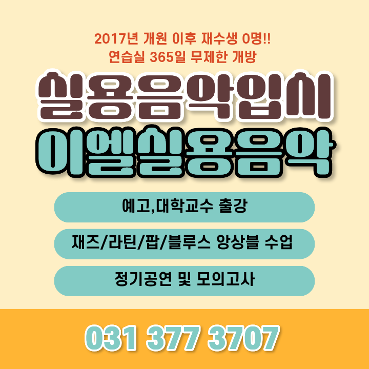 안녕하세요 #이엘실용음악학원 입니다 이엘실용음악학원 #실용음악입시 수강생들은 365일 연습실이 무료로 개방됩니다 수업시간 외에 #악기연습실 이용은 언제든지! 몇시간이든 이용 할 수 있습니다 2017년 개원하고 재수생이 단 한명도 발생하지 않은 실용음악입시 명문! 동탄 #실용음악입시전문학원 입니다! 이엘 #실용음악학원 입시 수강생들은 4가지 장르별 #앙상블수업 등 여러가지 프로그램이 진행되고 있습니다. 현직 한양대학교 출강교수님과 서공예등 유명 대학,예고 출강 강사진들에게 직접 배우는 전공레슨 및 앙상블수업이 있습니다. 또한, 3개월마다 공연을 통해서 앙상블 수업시간에 배운 곡들을 무대에서 연주해보는 기회가 있습....... <img src="https://blogthumb.pstatic.net/MjAyNjAxMDlfMTY4/MDAxNzY3ODg2MTI4MDgx.uMixb9rlJ04W61JWL5SvER1ejXdhQUSkxiZ0XRCq6jMg.r5v2ajqvaJOEjxI-pFdX3SDroNdik5lsQ3SnWbdEvCAg.PNG/%C1%A6%B8%F1%C0%BB_%C0%D4%B7%C2%C7%D8%C1%D6%BC%BC%BF%E4._%283%29.png?type=s3" />