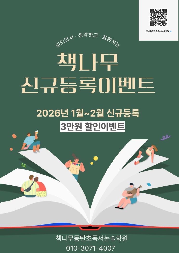 1월~2월 신규 등록 이벤트 안내 새해를 맞아 아이들의 읽기·쓰기 습관을 제대로 잡아줄 수 있는 기회, 책나무 동탄초점에서 신규 등록 할인 이벤트를 준비했습니다. 1월 ~ 3월 신규 등록 시 3만 원 할인 혜택 제공 책나무 동탄초점은 단순히 책을 많이 읽는 수업이 아닌, 정독을 통한 문장 이해 생각을 말로 풀어내는 북토킹 아이 눈높이에 맞춘 글쓰기 연습으로 문해력의 기초를 탄탄하게 다지는 수업을 진행합니다. 특히 방학 기간에는 아이들이 흐트러지기 쉬운 독서 리듬을 규칙적인 몰입독서 수업으로 잡아주어 학기 중 학습까지 자연스럽게 이어질 수 있도록 돕고 있습니다. 이런 아이에게 추천해요 책은 읽지만 내용 이해가 부족한 아....... <img src="https://blogthumb.pstatic.net/MjAyNTEyMThfMjI5/MDAxNzY2MDM1OTYwNTE0.nvkv4Bw1iEJkbAQEhgsU2S-CThyiSPMl4LEEcFKczbMg.TgBapq1Gd4zY7e_DsUeZJJfm8GZXGarX574H-NSBkTQg.JPEG/%BD%C5%B1%D4%C0%CC%BA%A5%C6%AE.jpg?type=s3" />