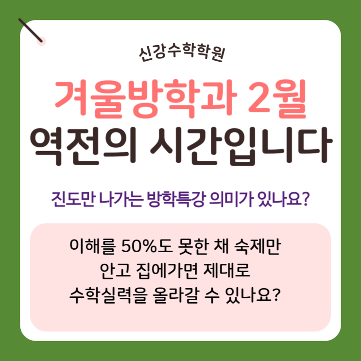 동탄 수학학원 신강수학학원입니다! 겨울방학의 막바지를 보내고 있네요! 겨울방학과 2월은 신학기를 시작하기 전에 부족한 수학 점수의 역전의 시간이 될 수 있습니다! 그런데 역전의 시간, 아이를 수학학원에 보내는 것만으로 안심하고 계시지는 않으신가요? 방학 특강을 듣고 있지만 수업의 50프로도 이해하지 못한 채 집으로 돌아와 풀리지 않는 숙제로 시간만 많이 보내면서 실력도 늘지 않고 짜증만 늘어가고 있는 것은 아닐까요? 진도는 나가고 있으니까...... 그 시간들이 아이에게 남는 것이 거의 없는 비효율적인 방학을 보내고 있을 수도 있습니다. 그렇다면 신강수학학원의 학생들은 과연 어떻게 이번 겨울방학을 보냈을까요? 동탄 수....... <img src="https://blogthumb.pstatic.net/MjAyNjAyMDJfMjkz/MDAxNzY5OTkwNzIwNDYw.9JL9HMsa-PKQJSA88md_Zqg1P-IuNhFHrJjEvBGR9qsg.Uua5oLzJqJrmnpDnhg7om-d_loJUqbowFjMpGcgh5Mkg.PNG/%C1%A6%B8%F1%C0%BB_%C0%D4%B7%C2%C7%D8%C1%D6%BC%BC%BF%E4_-001_-_2026-02-02T090452.720.png?type=s3" />