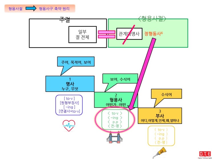 주절+종속절(명사절, 형용사절, 부사절) 형태의 복문을 만나면, 마치 동전의 양면처럼 명사구, 형용사구, 부사구로 전환된 형태를 동시에 이해하도록 가르쳐왔다. 절을 구로 축약하는데 있어서 본질적으로 이해해야 하는 것은 동사의 조건 6가지 (법, 인칭, 수, 시제, 상, 태)를 모두 갖춘 정형동사로 쓰이느냐, 아니면 상, 태만 갖춘 비정형동사(to부정사, 원형부정사, 현재분사, 과거분사, 동명사)로 쓰이느냐의 차이를 이해하는 것으로 귀결된다. 절을 구로 축약할 수 있고, 축약된 구를 다시 절로 환원하는 것을 자유자재로 할 수 있을 때까지 반복하여 연습하는 것이 이 공간이 지향하는 바이다. ******************************* 형용사절....... <img src="https://blogthumb.pstatic.net/MjAyNjAyMDVfMTMz/MDAxNzcwMjQ1MTIwMTEw.MyQzbqVQrP_n9bwZA7zTXS2pERFSeeR_b_f3i9Sdoecg.AtCeDA-fnuJvzug5rXAOYpLwteJysBgRHPkqQjBCo_Eg.JPEG/%C7%FC%BF%EB%BB%E7%C0%FD%C0%BB_%C7%FC%BF%EB%BB%E7%B1%B8%B7%CE_%C3%E0%BE%E0%C7%CF%B4%C2_%BF%F8%B8%AE.jpg?type=s3" />