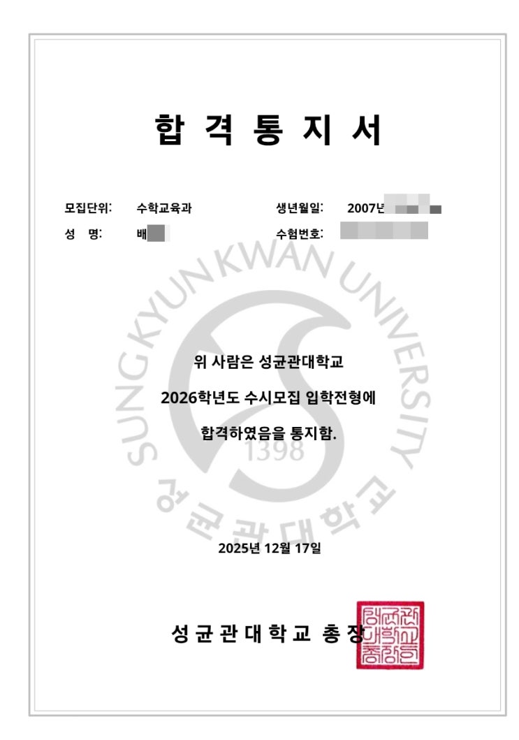2026년도 병점고 배ㅇㅇ 학생 성균관대학교 수학교육학과 합격