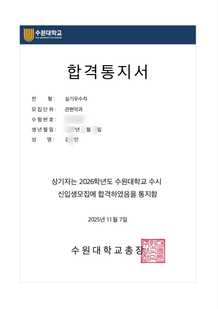 로뎀에서 고등학교 때 처음 전공을 시작했던 한 친구가 올해 '수원대학교' 수시 전형에 합격했습니다. 많은 분들이 “고등학교 때 시작하면 너무 늦은 거 아닌가?” 하고 걱정하시곤 합니다. 하지만 시작 시기가 조금 늦었다고 해도, 올바른 방향으로 꾸준히 준비한다면 충분히 원하는 결과를 만들 수 있습니다. 잘하는 학생을 더 잘하게 만드는 건 어렵지 않습니다. 하지만 로뎀은 여기에서 한 걸음 더 나아가, 학생 한 명 한 명의 목표, 가능성, 성향, 희망 대학을 꼼꼼히 분석하여 가장 효과적인 진로 전략을 함께 설계합니다. 함께 노력해주신 로뎀 선생님과 학부모님, 그리고 무엇보다 제일 힘들었을 학생에게 진심으로 축하의 마....... <img src="https://blogthumb.pstatic.net/MjAyNTEyMDNfMjk3/MDAxNzY0NzUzNzk3MTE2.LyaN6zsmVDqAyaQbS_tLj21GU5IunzKmQjnBhg-0p1Mg.iokI0hH7pY4ceLtNxBPFCgYwi9y4rsq05GfrzYcZnXQg.JPEG/%B1%E8%C7%FD%C0%CE_%C0%CC%B8%A7_%C1%F6%BF%EE%B0%C5.jpg?type=s3" />