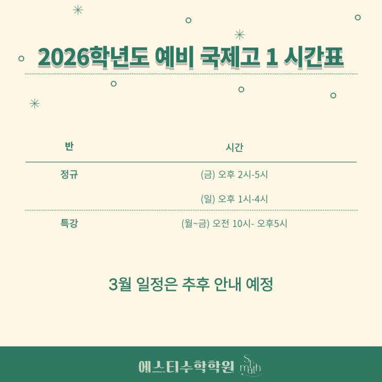 [에스티수학학원] 2026년 동탄국제고1,2 시간표 안내
