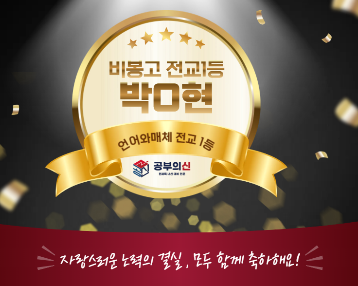 비봉고 언어와 매체 1등, 정말 축하합니다 이번 비봉고등학교 언어와 매체 내신에서 전교 1등 학생이 나왔습니다. 언어와 매체는 단순 암기나 문제 풀이만으로는 점수가 나오지 않는 과목입니다. 개념을 정확히 이해하고, 출제 방식에 맞게 적용할 수 있어야 안정적인 성적이 나옵니다. 이번 1등 학생 역시 수업에서 다룬 개념 구조화, 학교 시험에 맞춘 출제 포인트 정리, 오답을 통해 약점을 바로잡는 과정을 끝까지 성실하게 따라왔습니다. 특히 많은 학생들이 어려워하는 문법 개념의 혼동, 선지 판단에서의 실수를 수업과 피드백을 통해 꾸준히 교정해 나갔습니다. 성적은 우연이 아니라 과정이 쌓여 만들어지는 결과라고 생각합니....... <img src="https://blogthumb.pstatic.net/MjAyNTEyMjRfNDEg/MDAxNzY2NTc1Njk4NTIw.v9Uwgnenx3v3oNQ2iT2BqFLziCiLGceiz9-G88ZTNvog.lT0NcZhd_SJ011oNEY3w_cxN1PI4SQbJtRBRSHFEIrcg.PNG/image.png?type=s3" />
