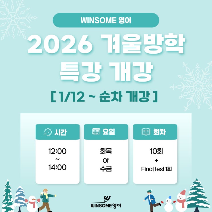 안녕하세요. 출제자의 시선으로 보다. 윈썸영어학원입니다! 지난번 2026 겨울 특강 일정 안내에 이어, 오늘은 겨울 특강 담당 선생님을 소개해 드리려 합니다! 매년 그렇듯 인기 강좌의 경우 조기 마감될 수 있으니, 등록을 희망하시는 분들께서는 학원으로 전화 문의 부탁드립니다! 각 특강별 권장 학년도 같이 확인해주세요. 다음으로는 지난주에 마무리 된 2학기 기말고사 대비 소식을 전해드리겠습니다. 우리 학생들이 최선을 다 했던 직보 현장 사진을 소개해 드릴게요! 먼저, 목동관입니다! 열심히 집중한 우리 아이들, 힘들겠지만 마지막까지 화이팅하는 모습이네요! 끝까지 포기하지 않고 최선을 다한 시간이였습니다. 다음은 나루관입니....... <img src="https://blogthumb.pstatic.net/MjAyNTEyMjRfNyAg/MDAxNzY2NTUwNTExNjY2.rOIizmDq-_jOtwV2vMO9Lu9SYL4XHosPjzBb1PVKBgkg.itPOZjLBBmvBlmy-XcPBy5V44zs9OawkVVaZejyY0Okg.JPEG/%C1%A6%B8%F1%C0%BB-%C0%D4%B7%C2%C7%D8%C1%D6%BC%BC%BF%E4_-001_%2813%29.jpg?type=s3" />