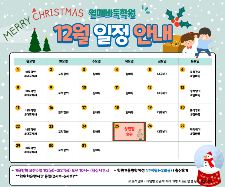 안녕하세요. 열매바둑학원 송열매 원장입니다 :) 매년 연말이 되면, 시간 참 빠르다. 라는 생각이 먼저 드는 것 같습니다. 그렇게 어른이 되어가는 것을 실감하게 됩니다 ㅎㅎ 열매바둑학원을 처음 개원했던 날 2022년 1월 12일. 아직도 생생하게 떠오릅니다. 코로나19로 힘들었던 시절...ㅎ 1명의 원생과 열매바둑학원을 시작했습니다. 그리고 2025년의 끝을 향해가는 지금 열매바둑학원이라는 이름에 걸맞게 풍성한 열매를 맺게 되었습니다. 학부모님들의 관심과 사랑에 진심으로 감사드립니다. 보내주신 관심과 사랑을 깊이 새기며, 원생들에게 흘려보내도록 더욱 노력하겠습니다^^ 열매바둑학원 2025년 12월 일정 안내드리겠습니다. 1. 12/25....... <img src="https://blogthumb.pstatic.net/MjAyNTExMjdfMjMg/MDAxNzY0MjE4NTI3MzU4.iV0wCFnnRo8wdjWbsFmPtHYxs7HHezcSVI9-QvjWVQgg.sr2dQ1an3mcNabVXL4kDiaA0ftlQMz3bcCBoQM-m6Xwg.PNG/2025.12.png?type=s3" />