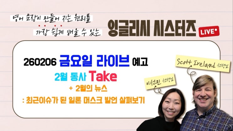 매 주 금요일 10시! 유투브에서 잉스(잉글리시시스터즈)에 들어오시면 무료로 라이브 강의를 시청하실 수 있습니다. <img src="https://blogthumb.pstatic.net/MjAyNjAyMDNfMTIx/MDAxNzcwMTE1Mzk5MTUz.TL_sSMrgzJQpyO5OVM5F4FSVDcrJznMWs1Y0SIO9Rkkg.qehKQMhqxL_qje5M1Zk8_jkl3FMChkJSnaOYCPZUI3cg.JPEG/IMG%A3%DF4645.JPG?type=s3" />
