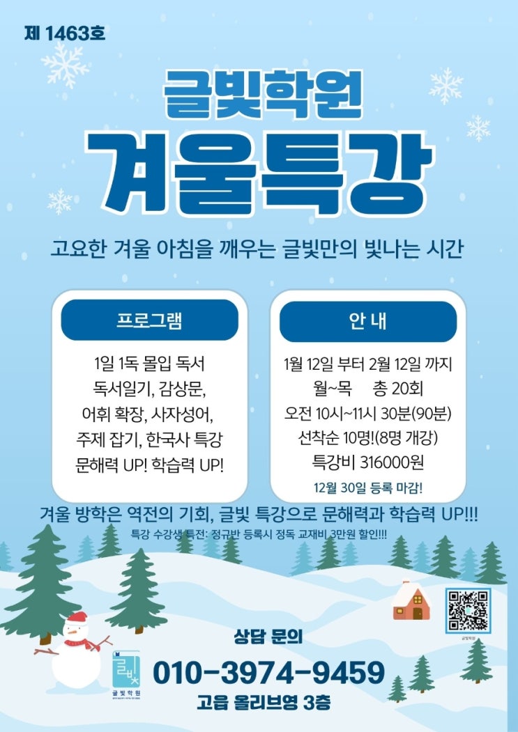 안녕하세요? 반짝반짝 빛나는 아이들의 성장을 지지하는 글빛학원의 글빛샘입니다. 12월이 어느새 열흘 정도 남았는데요. 곧 겨울 방학이 시작되는데요. 방학 되면 아이들의 하루 리듬은 쉽게 흐트러집니다. 늦잠, 늘어난 미디어 시간, 줄어드는 책 읽기. 하지만 바로 이 시기가 학습의 빈틈을 채우고, 실력을 끌어올릴 수 있는 가장 좋은 기회이기도 합니다. 글빛학원은 이번 방학을 맞아 ✔️ 문해력 ✔️ 읽기 습관 ✔️ 사고력과 표현력 ✔️즐거운 특별 강의 및 활동 을 집중적으로 키우는 방학 특강 프로그램을 운영합니다. --- ✏️ 왜 방학 특강이 중요할까요? 학기 중에는 학교 진도와 숙제로 ‘따라가기’에 급급하지만, 방학은 아이의....... <img src="https://blogthumb.pstatic.net/MjAyNTEyMThfMjg4/MDAxNzY2MDU0NDUwODM1.TYLfOSeoRSf5gaFVVFZfJWqwztVxXn0NvShXYcUon-Ug.8yVbALk2VT9buC4OzqWH7diyN4AKz0G7ifLDdB_FOo0g.JPEG/900%A3%DF%C7%CF%B4%C3%BB%F6_%B9%E8%B0%E6_%B4%AB%BF%C0%B4%C2_%BE%F0%B4%F6_%C7%B3%B0%E6_%BF%B5%BE%EE%C7%D0%BF%F8_%B0%DC%BF%EF%B9%E6%C7%D0_%C6%AF%B0%AD_%C0%FC%B4%DC%C1%F6.jpg?type=s3" />