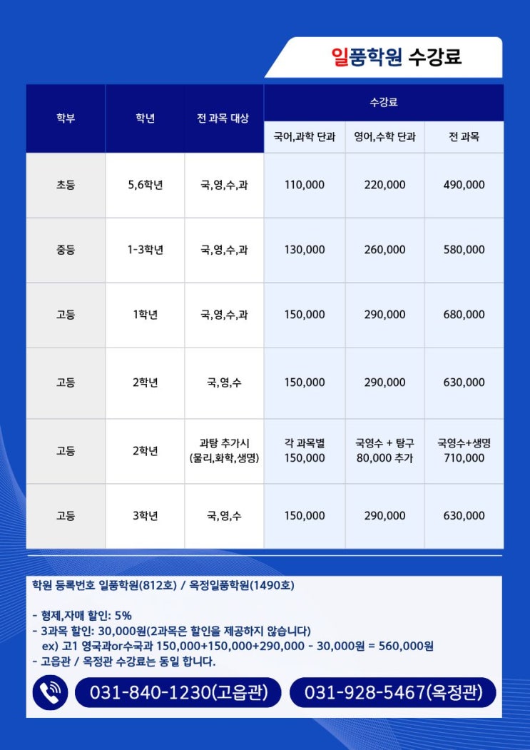 [일품학원] 고읍관/옥정관 학원등록번호/학원비 안내
