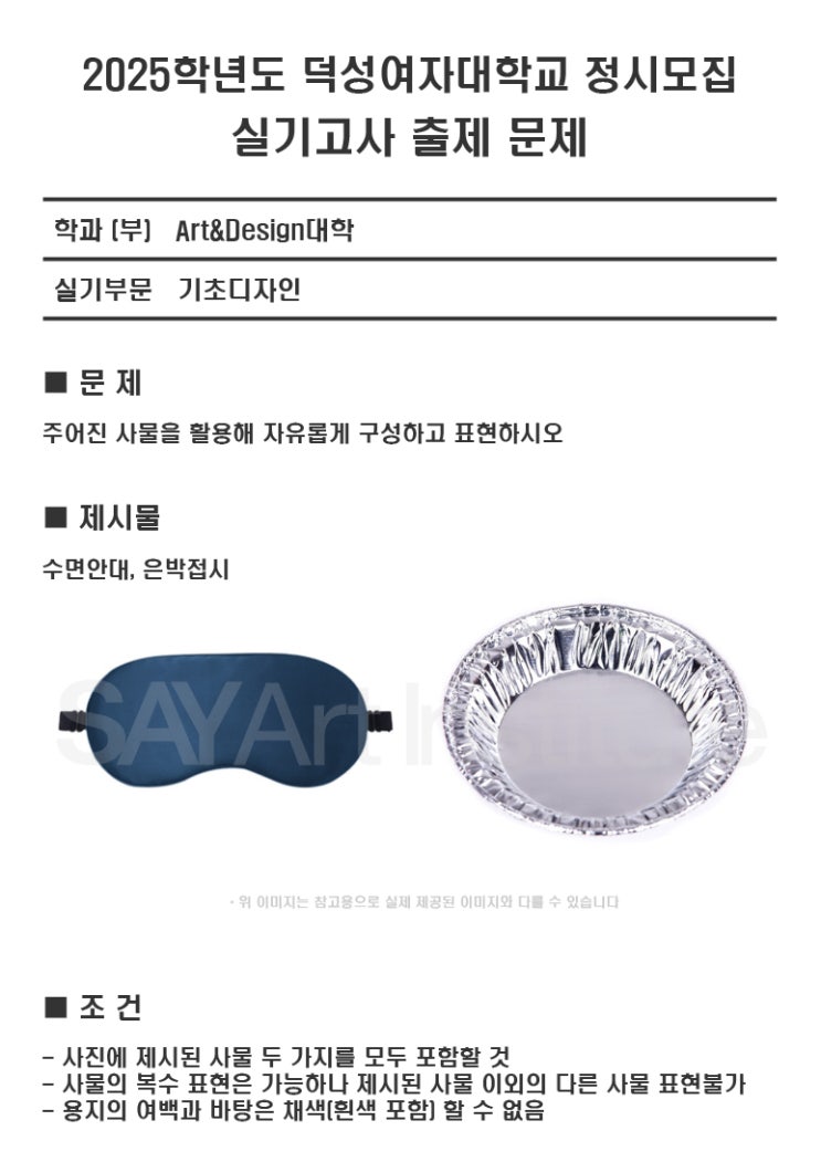 중랑구 광진구 입시학원 SAY 미술학원입니다. 덕성여대 2025학년도, 2024학년도 정시 <나군> 기초디자인 실기 문제 덕성여대 미대는 반영비는 성적에 대한 부담이 낮은 대학 중 하나죠 수시모집은 실기 100% 정시모집은 수능 20% + 실기 80% 수능반영 방법도 국어, 수학, 영어, 탐구(1과목) 중 우수한 성적 2개 영역 각 50%씩 반영합니다. 덕성여대 Art&Design대학 2025학년도 모집인원과 경쟁률 기초디자인 - | 18명 | 23.22 : 1 기초소양 - | 5명 | 21.20 : 1 중랑구청사거리 중랑SAY미술학원 : 02 432 6220 군자역 광진SAY미술학원 : 02 457 6220 - 덕성여대 2025학년도 수시모집 기초디자인 주제 및 유형 분석 - https://blog.nave....... <img src="https://blogthumb.pstatic.net/MjAyNjAxMTZfNyAg/MDAxNzY4NTIzNDgzMTU3.vfhYoSbQKxi9FiPec96qSEG8kUC6NTkkRB0fhE7YKlYg.uCFuJdWXML2XQb7VB1p4L8ihLf-m1Y6y8vvQHEc8f1Yg.JPEG/%B3%AA%B1%BA_%B4%F6%BC%BA%BF%A9%B4%EB_%B1%E2%B5%F0_17.jpg?type=s3" />