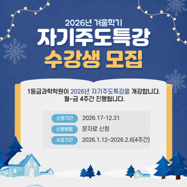 2026년 겨울학기 자기주도 특강 수강생 모집 방학 동안 스스로 계획하고, 점검받고, 성장하는 학습 자기주도 특강이란? 자기주도 특강은 학생이 스스로 학습 계획을 세우고 선생님의 관리·피드백을 통해 학습 습관과 집중력을 함께 키우는 특강입니다. 방학 기간 동안 ✔ 계획 수립 ✔ 실행 ✔ 점검 ✔ 피드백 을 반복하며 학습의 틀을 완성합니다. 특강 내용 • 선생님과 함께 4주 학습 계획 작성 • 매일 플래너 작성으로 하루 학습 관리 • 매일 선생님이 학습 내용 점검 • 학습 진행 상황을 보호자께 문자로 안내 수업 정보 • 장소: 충혼길 28 미래GT학원 (1등급과학·수학관) • 수강 기간: 2026.1.12 ~ 2026.2.6 (4주....... <img src="https://blogthumb.pstatic.net/MjAyNTEyMTdfMjgx/MDAxNzY1OTQ1NzY4NzQ2.2SzO17d0VfBNNyQiQKjsKAvfldlo2sx6X961b3OGx_kg.BC9cKTsza_pu_U3Ijjc4xb2OS7bmA2TRmr9rwSgVo08g.PNG/900%A3%DF2.png?type=s3" />