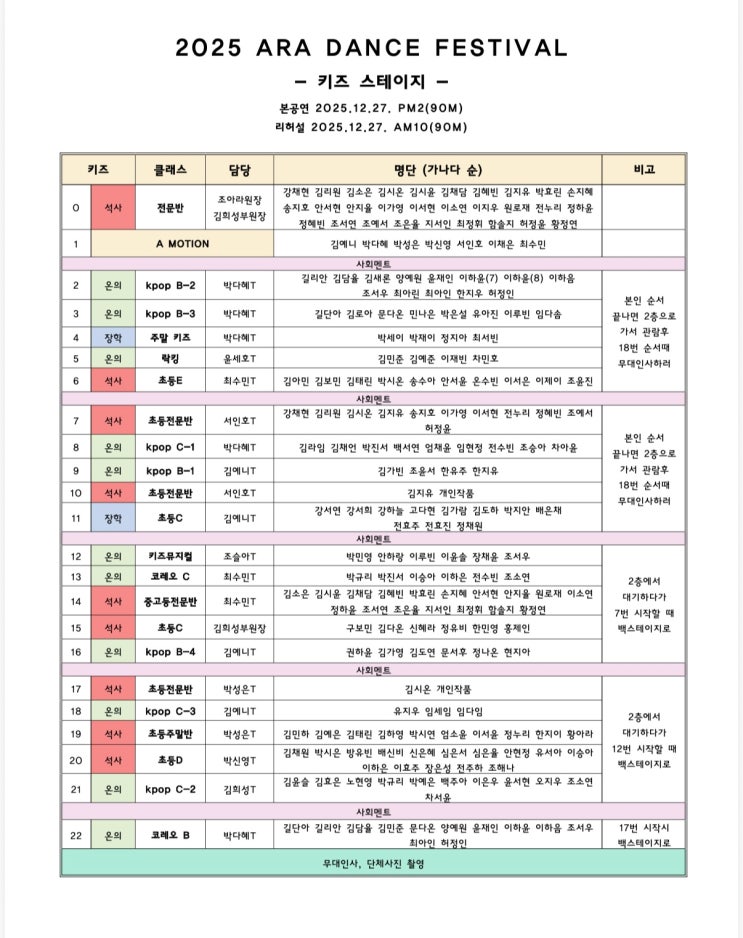 키즈 & 유스 공통 공지사항 이번주 금/토는 발표회로 석사.장학.온의 모든 수업 휴강입니다(횟수 차감X) 공연 마지막에는 무대인사 및 단체 촬영이 있습니다. 본인 공연 순서가 끝난 후에는 스태프 안내에 따라 이동해 주세요. 부모님과의 만남은 공연 종료 후 가능합니다. *리허설 종료 후 공연 시작 콜타임까지 시간이 길지 않아, 선생님들이 아이들을 인솔하여 대기 및 이동을 관리할 예정입니다. 학부모님께서는 공연 시간에 맞춰 도착해 주시면 됩니다. 순서표 확인 필수 순서표 비고란에 기재된 본인 순서 전·후 이동 장소를 반드시 확인해 주세요. 무대인사 안내 무대인사 시 크리스마스 아이템 자유 착용 가....... <img src="https://blogthumb.pstatic.net/MjAyNTEyMjNfMjQw/MDAxNzY2NDc2MjE4Mzcz.2It5xEJhcgXX_kvx1LBwXxK2XdHxwoBQLpQsNjr4PeQg.k2cT0Y7W-oqG5-yS0JeMW9OpZ8-q6QS6csMeMyFlQiMg.JPEG/KakaoTalk_20251223_154925135_01.jpg?type=s3" />