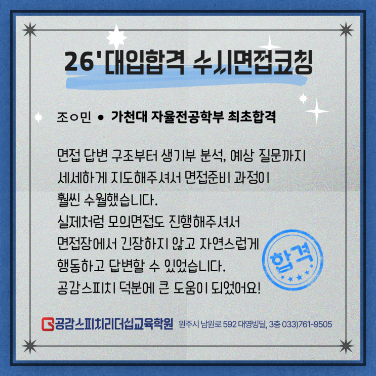 조ㅇ민 가천대 자율전공학부 최초합격 면접 답변 구조부터 생기부 분석, 예상 질문까지 세세하게 지도해주셔서 면접준비 과정이 훨씬 수월했습니다. 실제처럼 모의면접도 진행해주셔서 면접장에서 긴장하지 않고 자연스럽게 행동하고 답변할 수 있었습니다. 공감스피치 덕분에 큰 도움이 되었어요! #공감스피치 #원주스피치학원 #가천대 #자율전공학부 #광운대 #소프트웨어학과 #인하대 #AI공간정보학과 #건국대 #시스템생명공학과 #서울과학기술대 #바이오메디컬학과 #을지대 #임상병리학과 #덕성여대 #과학기술학부 #성신여대 #소비자산업학과 #차의과학대 #간호학과 #수시면접 #대입면접 #대학합격 #면접코칭 #면접준비 #합격후기 #면접꿀팁 #....... <img src="https://blogthumb.pstatic.net/MjAyNTEyMjBfMTEy/MDAxNzY2MTk3ODExNzUw.Wd6gAKv9kS9xxCGF_0YEbwadQ9BQHgg5ujYWHv77LzMg.skTSblMvUSf5L2x5hr1MagumpuvWHHDzE_OlIAyqXfMg.PNG/%C1%A6%B8%F1%C0%BB_%C0%D4%B7%C2%C7%D8%C1%D6%BC%BC%BF%E4._%2812%29.png?type=s3" />