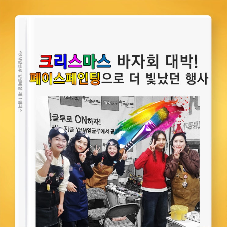 원주 태장동 영어수학 학원 YBM잉글루 이번 크리스마스~ 대박 재밌었어요~^^ 후기 전해드립니다. 이번 크리스마스 바자회에 대한아트페이스 페이팅협회 1365 '그리다' 에서 페이스페인팅 지원을 나와 주셨어요~! 오오옼~ㅎ 즐거운 크리스마스 바자회 25년도 마지막 연말행사인데 페이스페인팅으로 더 큰 추억을 만들어 주셨답니다. 저희 학원에 다니는 자녀의 학부모님들께서는 대한아트페이스협회 1365 '그리다'를 하고 계셨더라구요 1365가 1년 365일 자원봉사센터인데 정말 대단하지 않나요?ㅎ 이렇게 페이스페인팅도 받고 크리스마스 포토존에서 사진 찍으면~ 잉글루 게임권도 받고 먹거리 중 한개를 무료로 먹을 수 있....... <img src="https://blogthumb.pstatic.net/MjAyNjAxMTZfMTAx/MDAxNzY4NTM2ODg0MTY2.ZKRkqJm82579kEjan8AbcnkInAeDj8hSCWPb1oF6nesg.LFApKFQyMBvneXwiokhmh4Y1gWe3Oi7iqqzyONrQHA8g.JPEG/%BD%E6%B3%D7%C0%CF_copy.jpg?type=s3" />