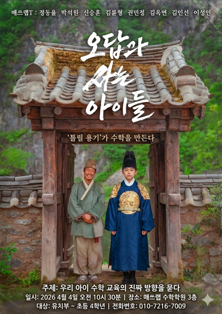 "AI는 1초 만에 정답을 내놓지만, '왜?'라고 묻고 오류를 찾아내는 힘은 오직 인간의 뇌에서 나옵니다." 우리 아이의 수학 첫걸음인 **'마테킨더'**부터, 사고력의 틀을 잡는 '씨투엠 클래스/RAT', 그리고 대치동이 선택한 무(無)힌트 심화 **'우보수학'**까지! 매쓰랩이 제안하는 수학 교육의 정수를 학부모님이 직접 학생이 되어 체험해 보는 특별한 시간을 준비했습니다. 일시 및 장소 일시: 2026년 4월 4일 (토) 오전 10시 30분 장소: 매쓰랩 수학학원 3층 대상: 유치부 ~ 초등 4학년 자녀를 둔 학부모님 (선착순 예약제) [Direct Experience] 매쓰랩의 4단계 사고력 체험존 이....... <img src="https://blogthumb.pstatic.net/MjAyNjAzMTZfNTYg/MDAxNzczNjM0MjU1NjU0.yGPzRsJE6I_oFqGRxWURlQCNCyoMv0mUyWlvr0Ccmrog.9_PVXkk7F0xjZty6RDqwRmTQppqDSwPVb7caZlRITTUg.PNG/KakaoTalk_20260310_180143637.png?type=s3" />